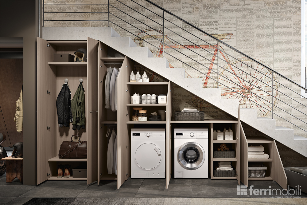 Se lo spazio che hai a disposizione è abbastanza grande, puoi sfruttare il sottoscala come un angolo salvaspazio per tenere in ordine tutta la casa. Ad esempio, all’ingresso puoi ricavare un angolo dove posizionare un appendiabiti e trasformarlo in un piccolo guardaroba da sfruttare per il cambio abito o per riporre giacche, sciarpe e indumenti invernali. Oppure puoi utilizzarlo come ripostiglio, dispensa o scarpiera grazie a cassettoni a scorrimento o scatole contenitore, così da avere tutto sempre in ordine e a portata di mano!