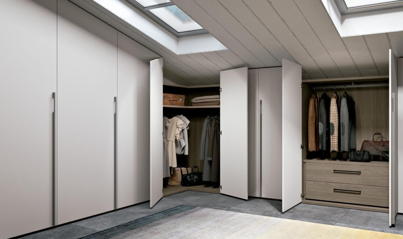 I moduli seguono l’inclinazione della falda, le ante possono essere sagomate o inclinate, le profondità vengono calibrate in base all’uso reale.