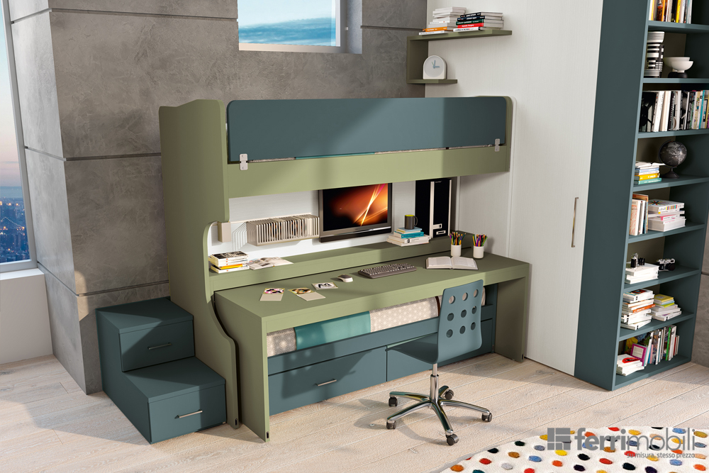 La cameretta con letto a soppalco permette di organizzare gli spazi secondo le varie funzioni (gioco, studio, riposo). Lo spazio sotto al letto può diventare una zona gioco protetta da personalizzare a piacere: con l’aggiunta di una tenda colorata, può diventare una capanna teatro di mille giochi; con l’inserimento di una scrivania o di un divanetto può essere una zona lettura o relax dove ospitare gli amici.