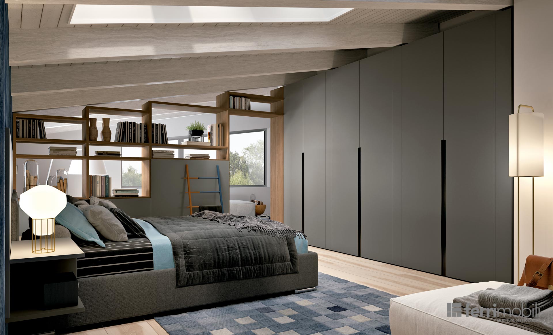 Con mansArmadio® puoi arredare una parete continua, anche quando il soffitto è inclinato, e impreziosirla se vuoi con un’elegante libreria. Oppure puoi creare una zona studio e smartworking con scaffali a vista e ante che celano quello che non vuoi mostrare.