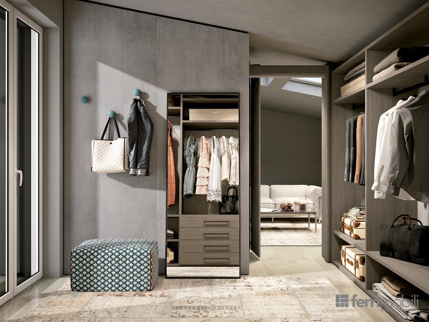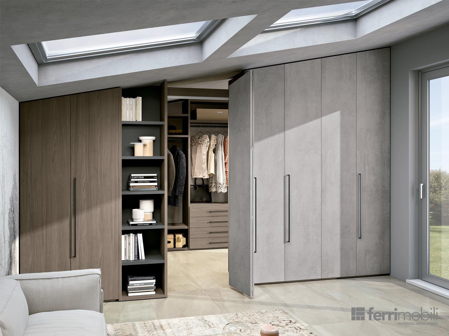 L’armadio bifacciale divide la zona giorno dalla cabina armadio realizzata con il sistema a spalla LOOK. Le ante dell’armadio ed il portale di passaggio sono a soffietto con taglio inclinato: grazie a questa soluzione è possibile avere vani unici larghi fino a 120 cm. Le diverse finiture delle ante e la libreria inserita di fianco al portale alleggeriscono visivamente tutta la composizione.