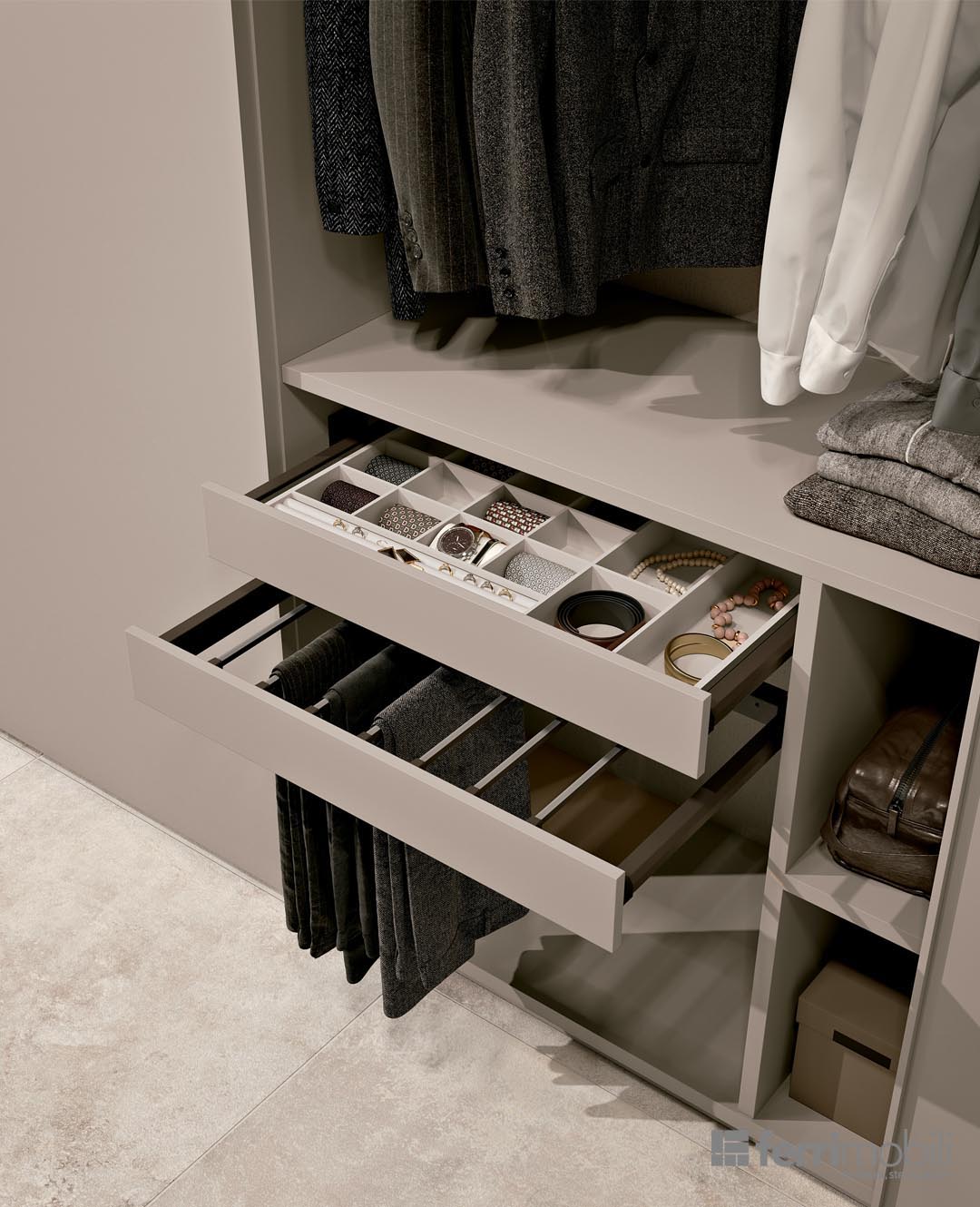 Armadio scorrevole con pensili mansardati in sovrapposizione: questa soluzione permette di soddisfare chi ha l’esigenza di un armadio scorrevole senza rinunciare a sfruttare tutto lo spazio in altezza anche in ambienti mansardati. Internamente, l’armadio è stato attrezzato con elemento Tee, ripiano estraibile portapantaloni e cassetto portagioie.