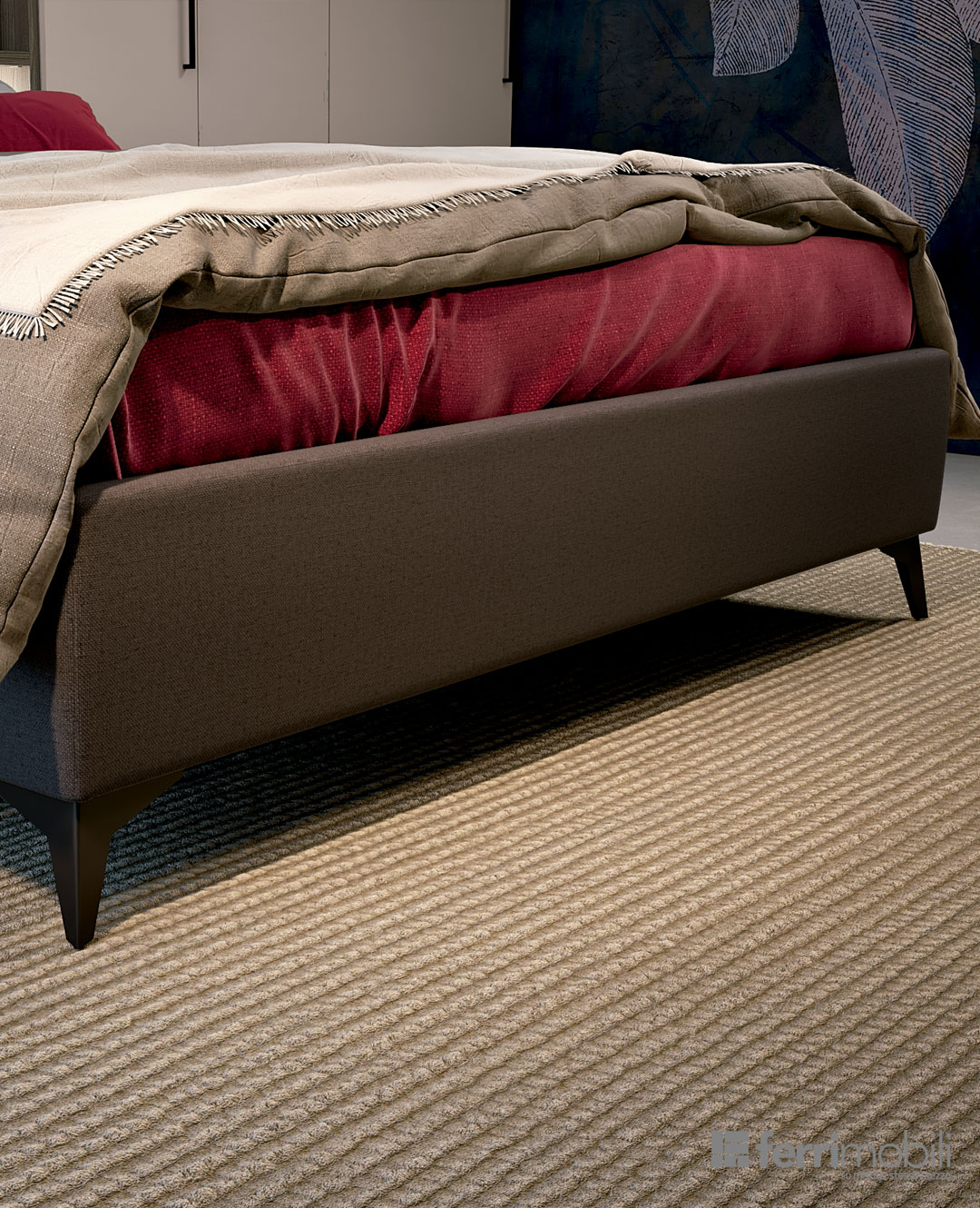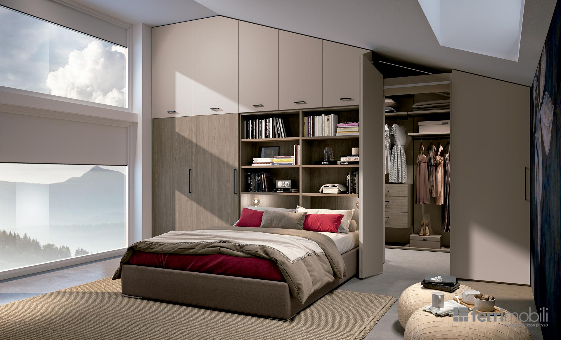 Da un unico grande ambiente mansardato è stato possibile ricavare un’ampia camera matrimoniale e una capiente cabina armadio. Il portale a soffietto da accesso alla grande e completa cabina armadio, realizzata col sistema cremagliera Railsystem. La cabina Railsystem è attrezzata con ripiani portascarpe inclinati, cassetti, cassetto portagioie e portapantaloni estraibile.