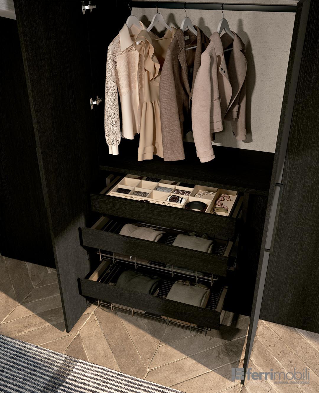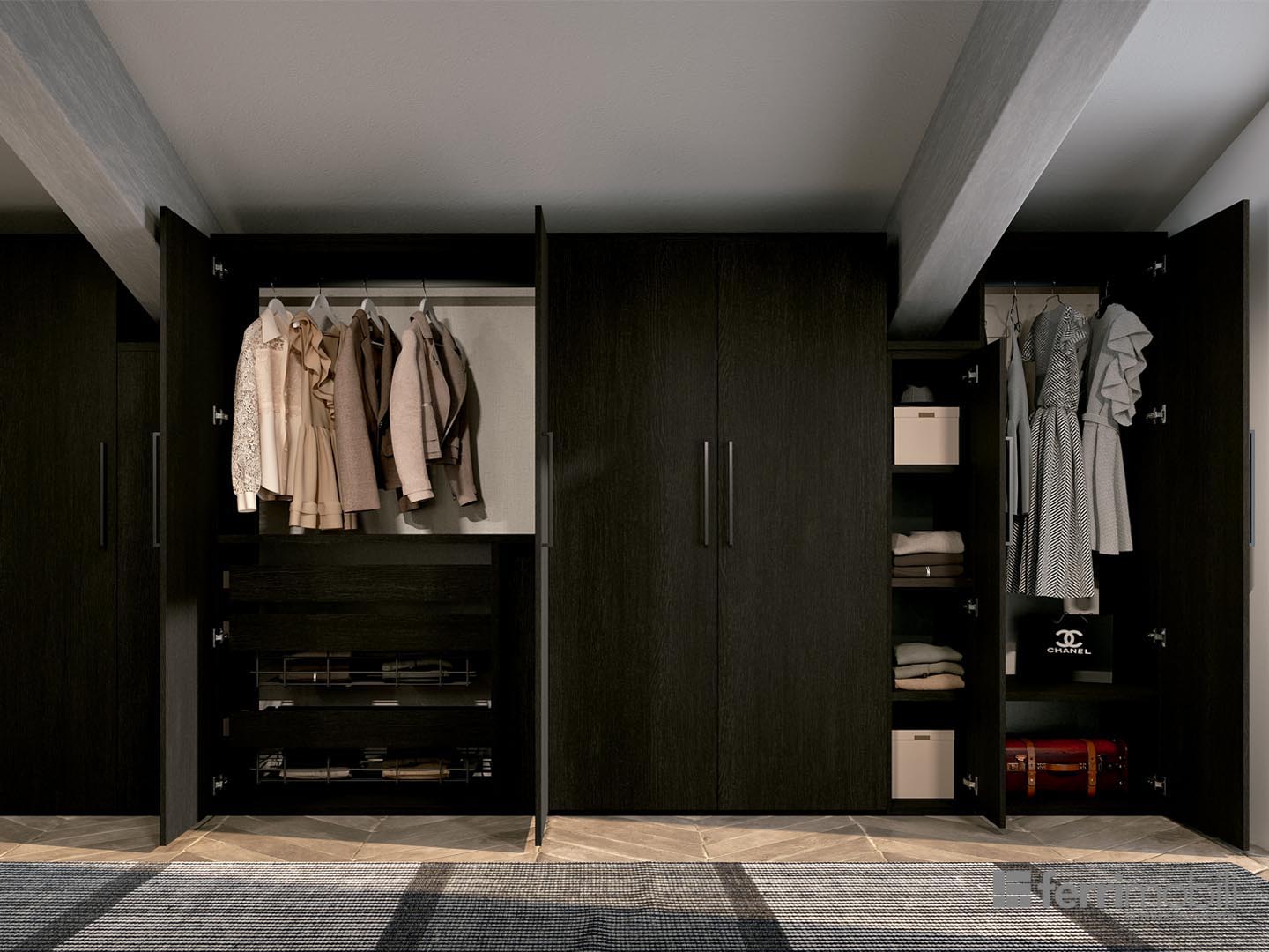 La libreria bifacciale divide la zona letto da quella armadio. L’armadio è stato realizzato in funzione dello spazio tra le travi e con due piccole colonne viene utilizzato lo spazio sotto le travi stesse. L’attrezzatura interna è composta da cestelli estraibili e cassetto con vano portagioie.