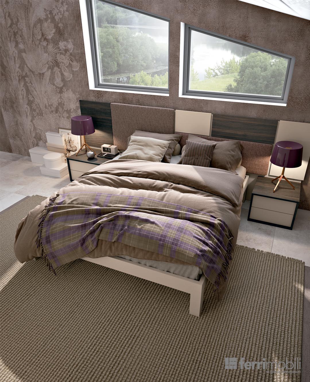 Letto: Olmo Arso, Cipria, Tessuto Operato Prugna
