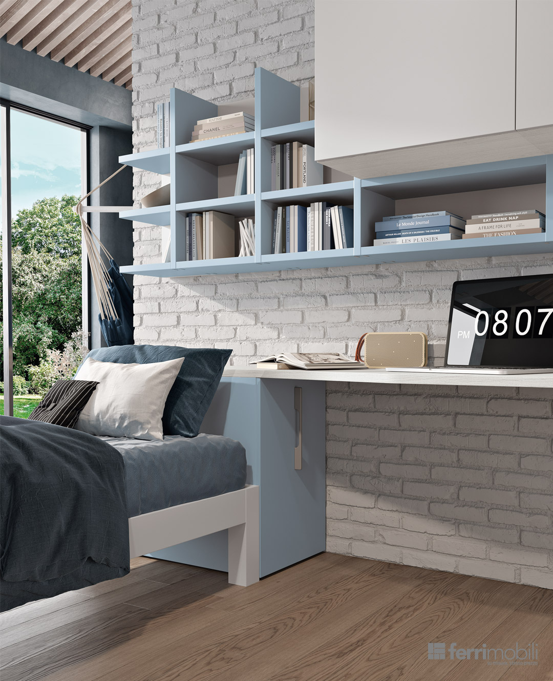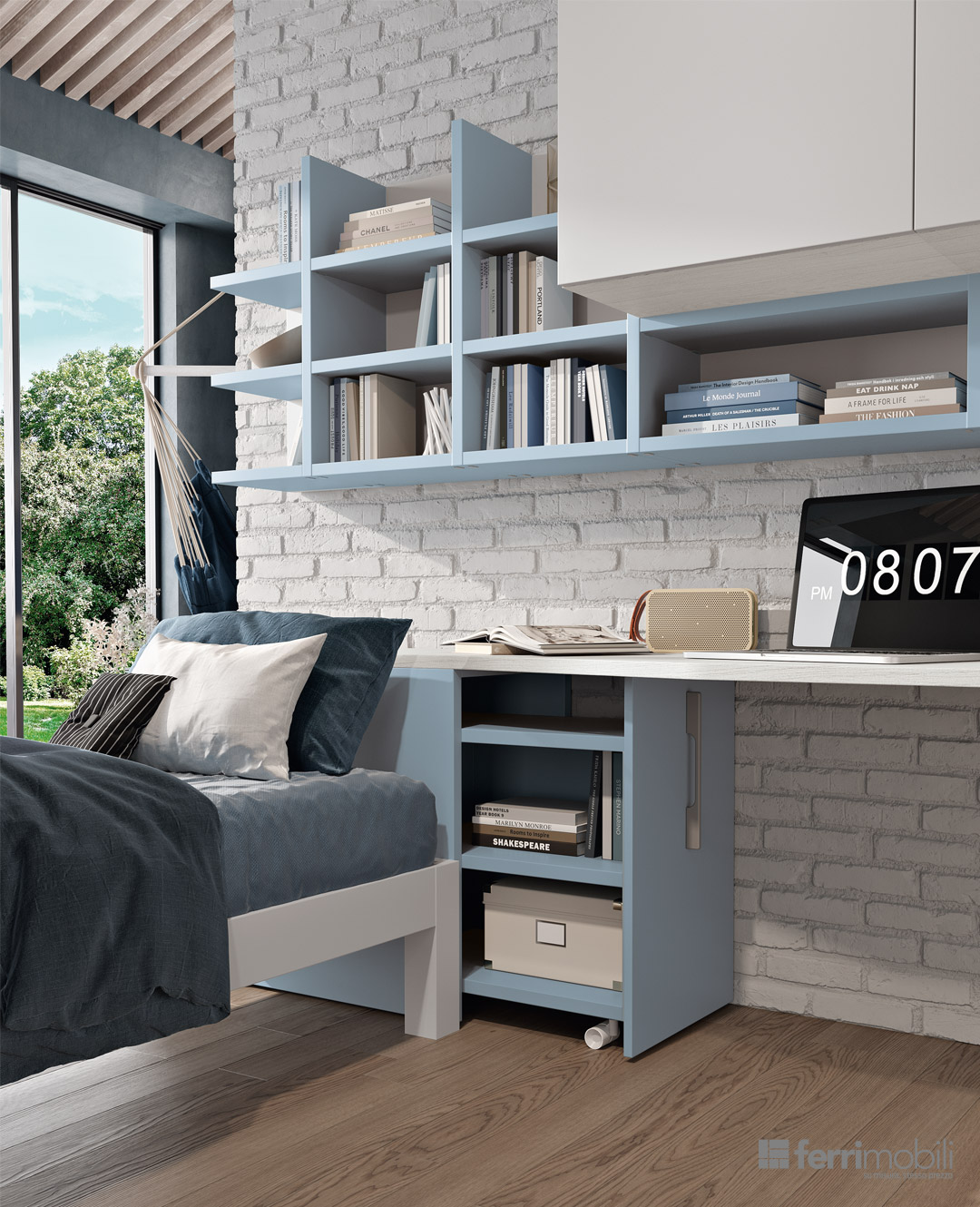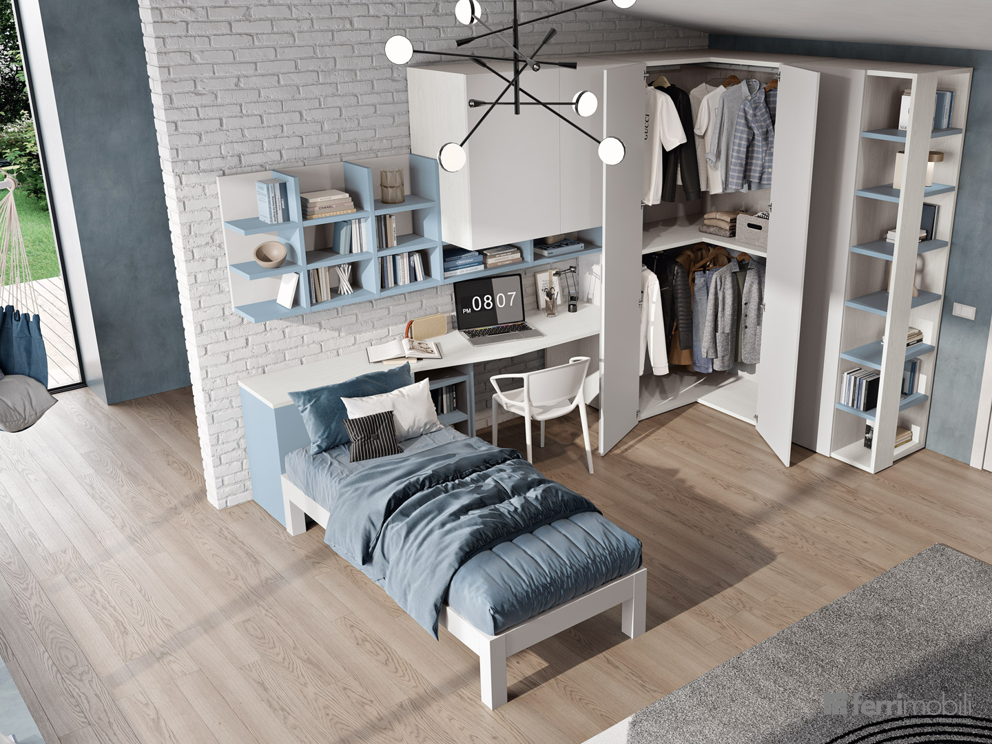 Una stanza particolare con una soluzione particolare. Il letto si appoggia alla struttura della scrivania che contiene un elemento su ruote. Il ponte sospeso con libreria e pensili chiusi si unisce all’armadio ad angolo che finisce con una libreria terminale.
