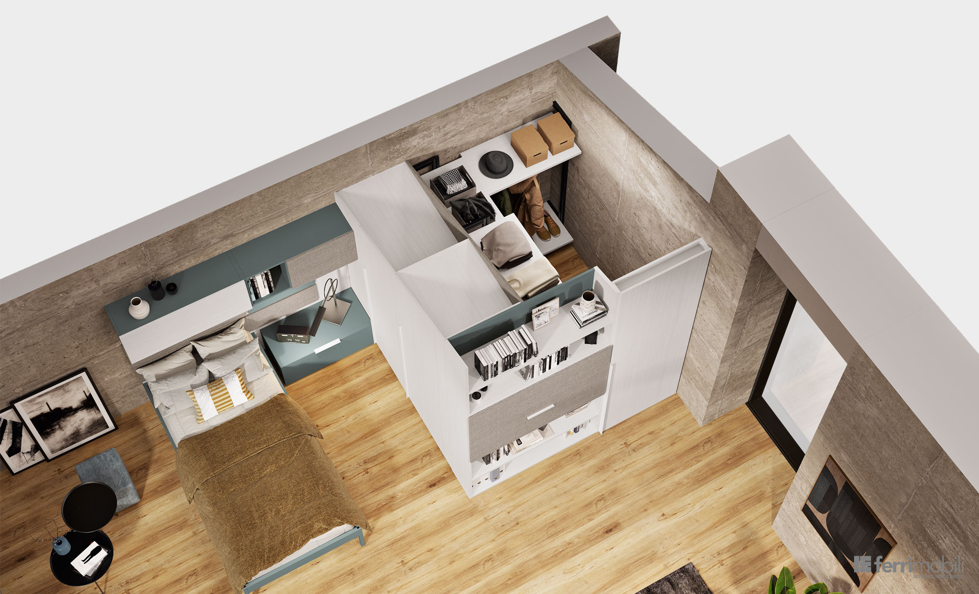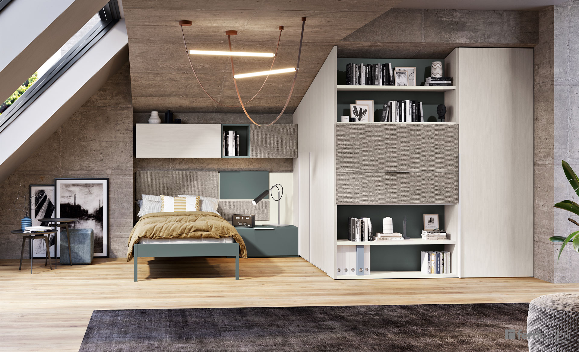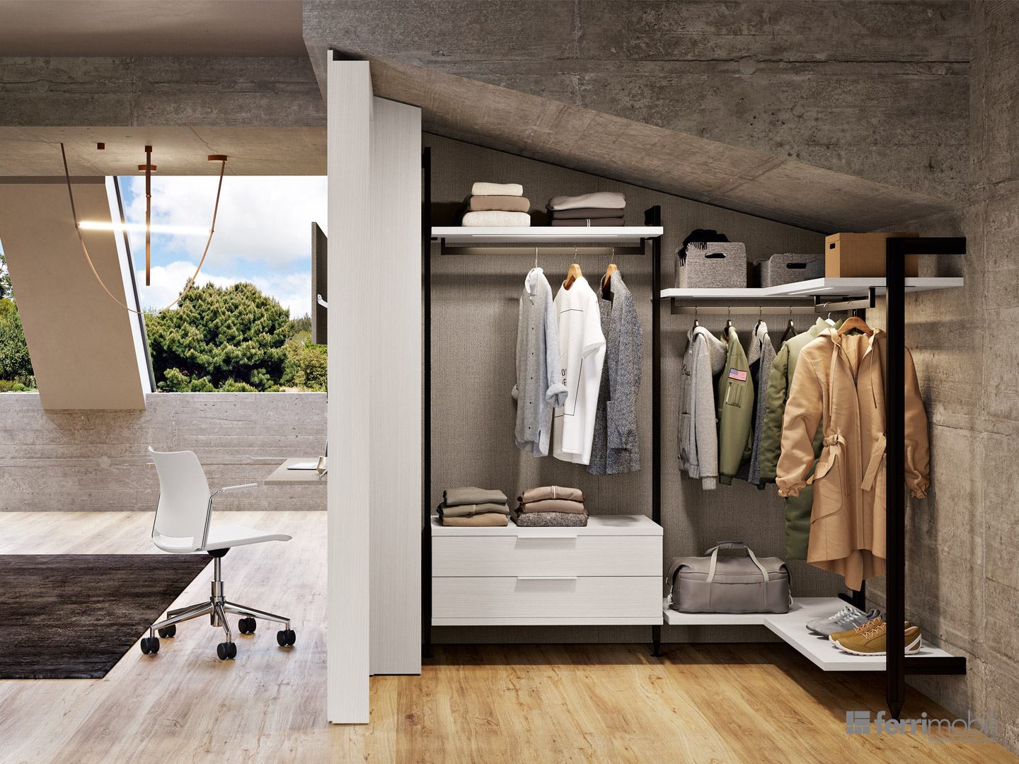 Anche in una mansarda il progetto “Camera in Camera” ci permette di integrare in un’unica struttura tutte le funzioni di una camera tenendole al contempo separate. Particolare la scrivania Evo2 con piano a ribalta e anta superiore traslante integrata nella libreria. L’interno della cabina armadio è attrezzata con il sistema pali Planet.