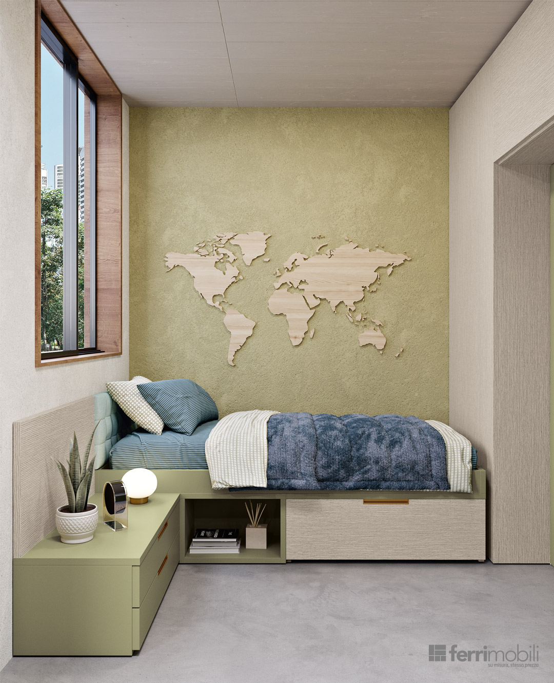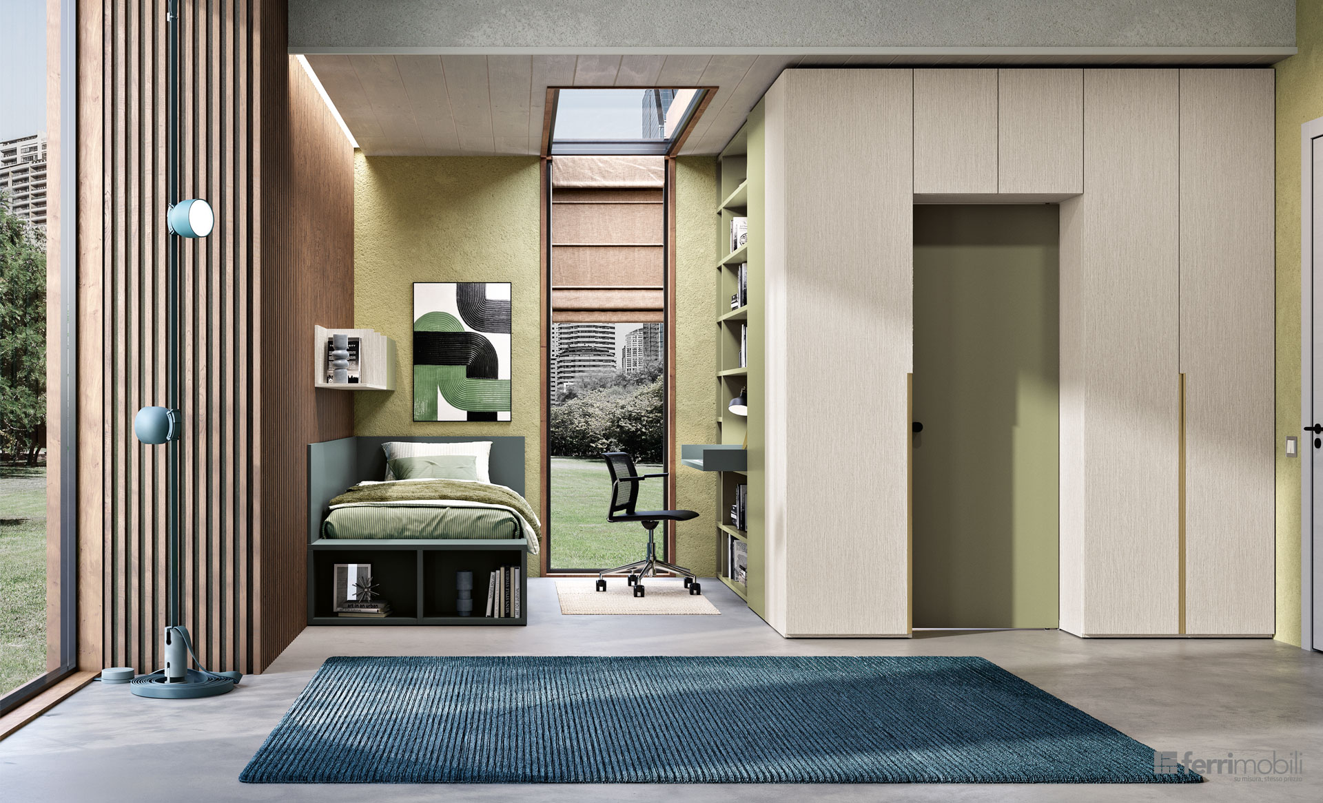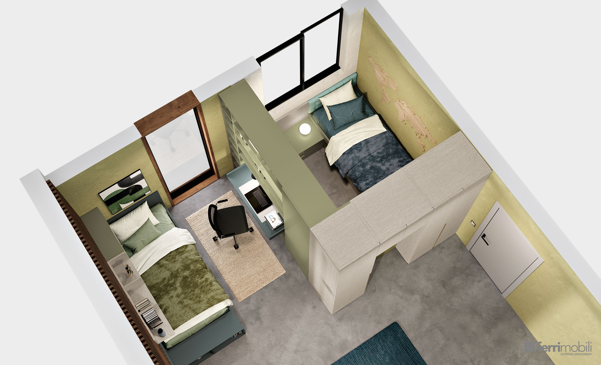 Una stanza e due figli; grazie a “Camera in Camera” possiamo creare due zone separate e dare ad ognuno la privacy che desidera. I due letti sono separati dagli armadi con porta a battente e dalla libreria con scrivania integrata. La porta a battente Balance permette l’accesso alla seconda stanza.