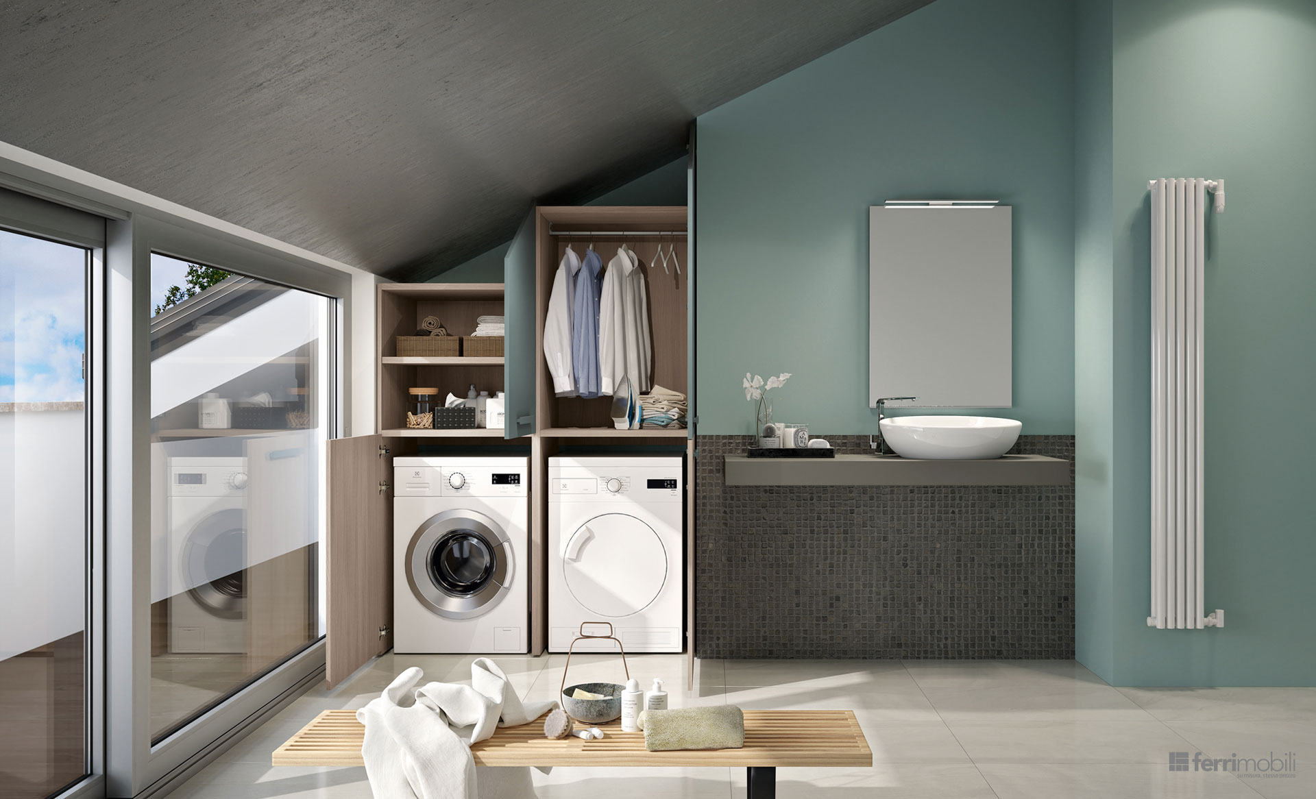 Una nicchia attrezzata a lavanderia in un bagno mansardato. Le due colonne senza zoccolo sono predisposte per contenere lavatrice ed asciugatrice. Per essere utilizzate più comodamente le ante inferiori si aprono indipendentemente dalle ante mansardate superiori.