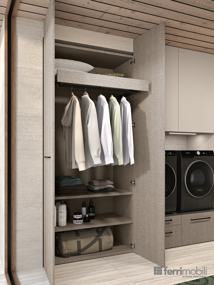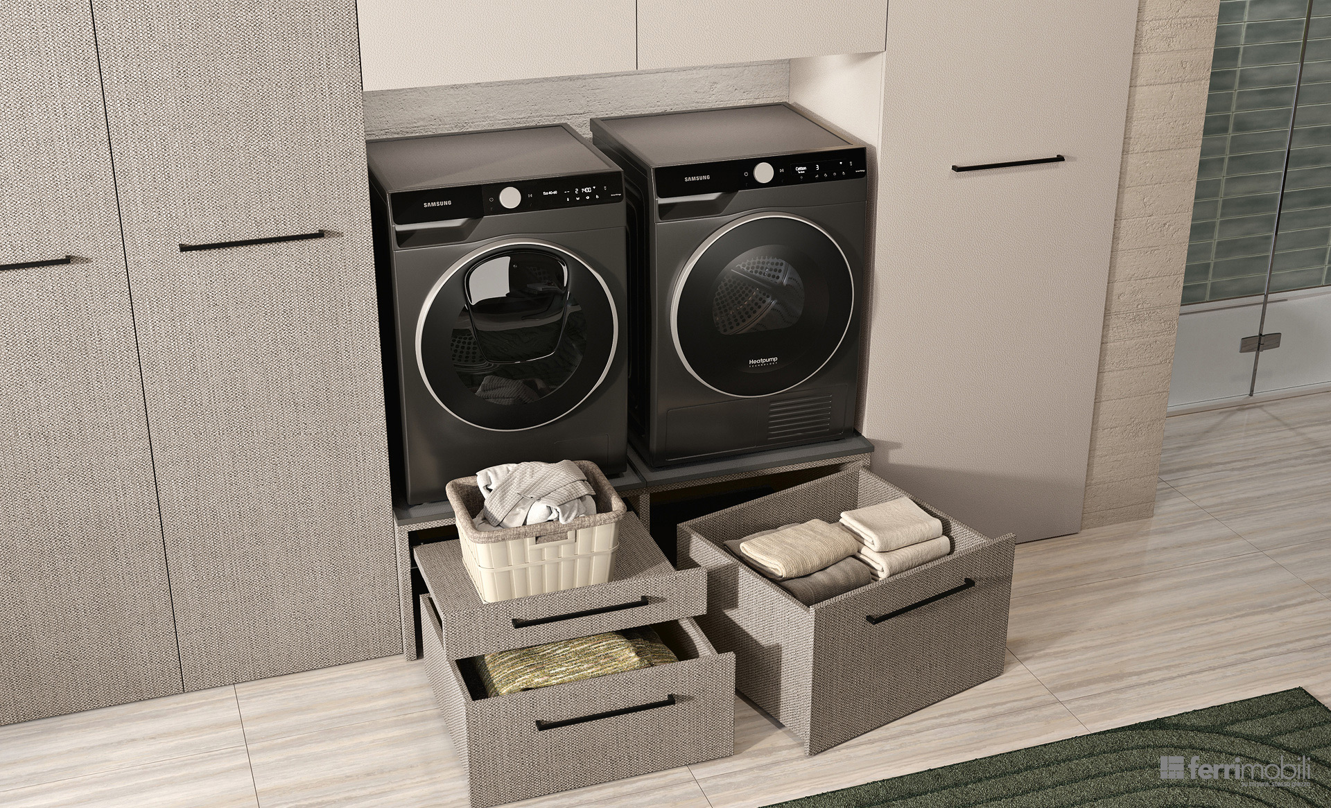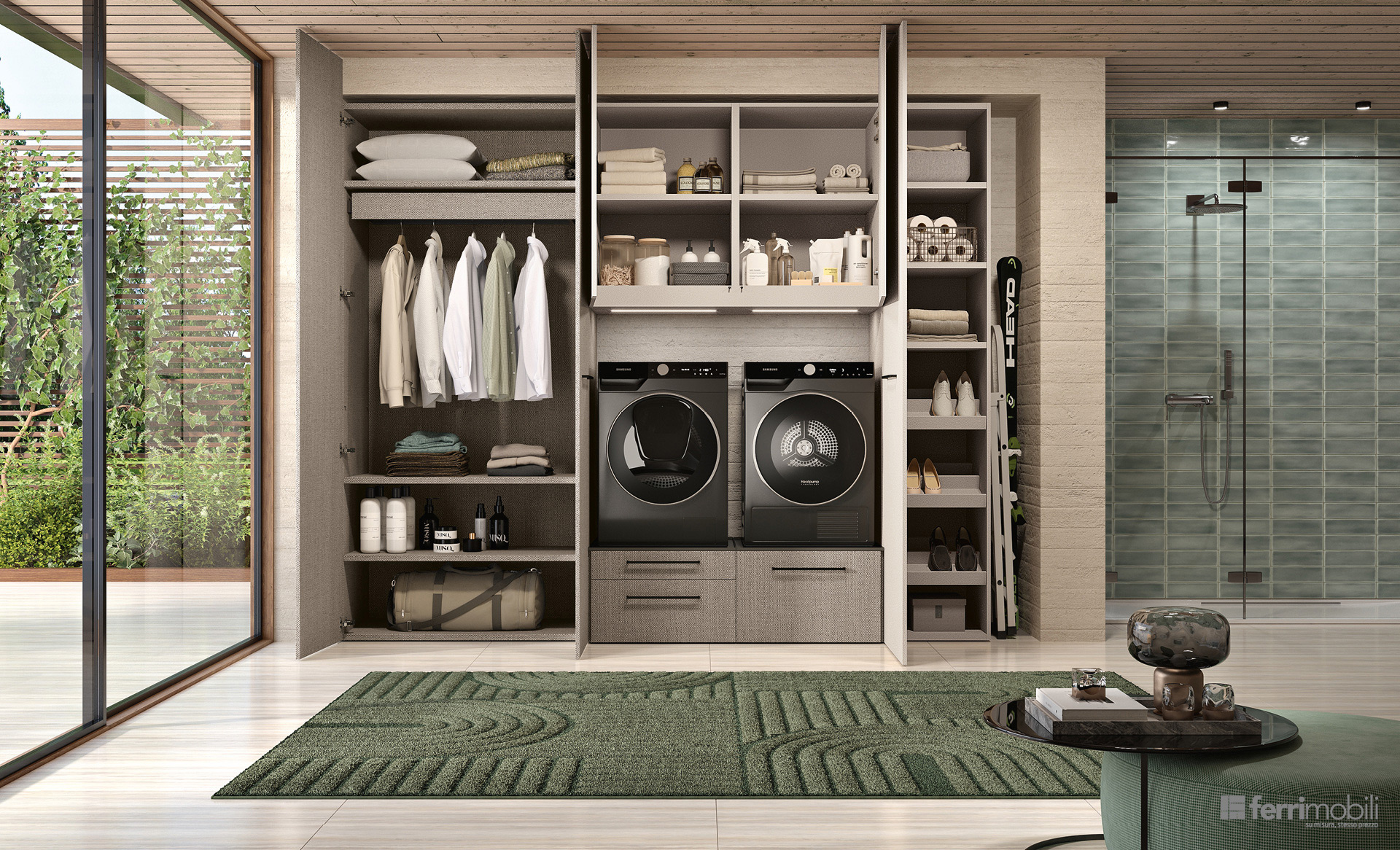 Una soluzione che interpreta la nicchia con intelligenza progettuale: le ante, volutamente più ampie in altezza e larghezza rispetto alla struttura, permettono di chiuderla perfettamente. In questo modo l’arredo mantiene proporzioni funzionali e genera lateralmente un pratico spazio di servizio. La nuova base di appoggio Podio per elettrodomestici integra un ripiano estraibile Hulk e un cestone con ruote, mentre nell’armadio trova posto