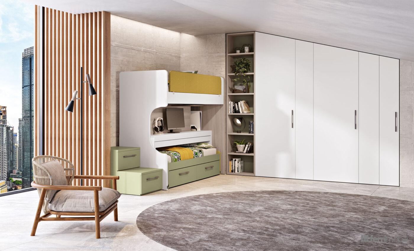 Sistema Multicameretta Prodotto Cameretta Mansardata Cameretta mansarda a ponte con cabina ad angolo – Composizione 117 Una mansarda molto luminosa dove la composizione si sviluppa su di un’unica parete. Dalla cabina ad angolo parte il ponte sospeso a cui si integra una libreria che segue l’inclinazione del soffitto. Sotto al ponte una struttura con cassettoni, […]