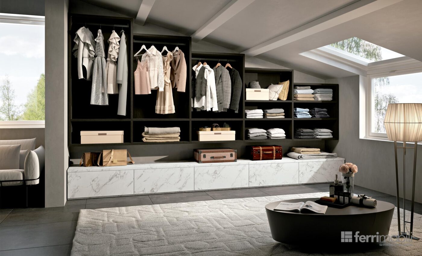 Sistema Mansarmadio Prodotto Cabine armadio Cabina Look appesa – Composizione 26 INFO DETTAGLIO La cabina armadio Look a muro permette di arredare in maniera elegante e funzionale la zona guardaroba anche in un ambiente mansardato. La parte superiore si sviluppa in larghezza utilizzando tutto lo spazio a disposizione tra una trave e l’altra. Tutti i […]