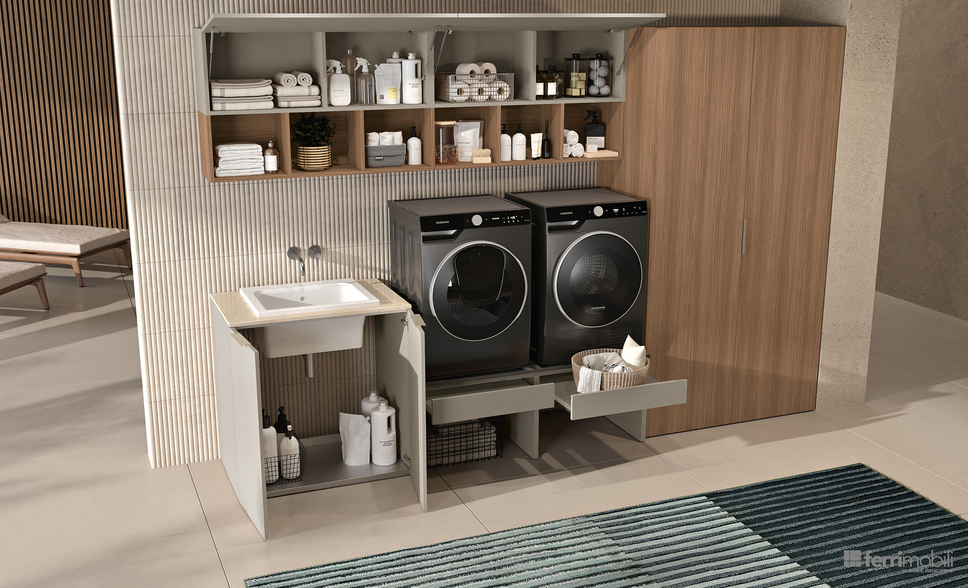 La base con lavello definisce l’area operativa, mentre il nuovo elemento di appoggio Podio per lavatrice e asciugatrice integra il ripiano estraibile Hulk, pensato per facilitare le operazioni di carico e scarico del bucato. A completare la composizione, l’armadio con anta a soffietto nasconde un vano attrezzato con