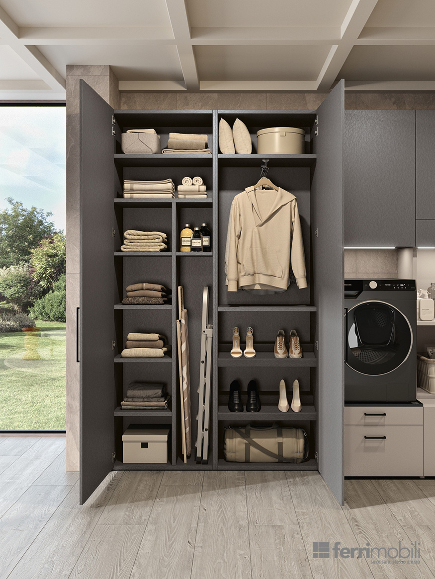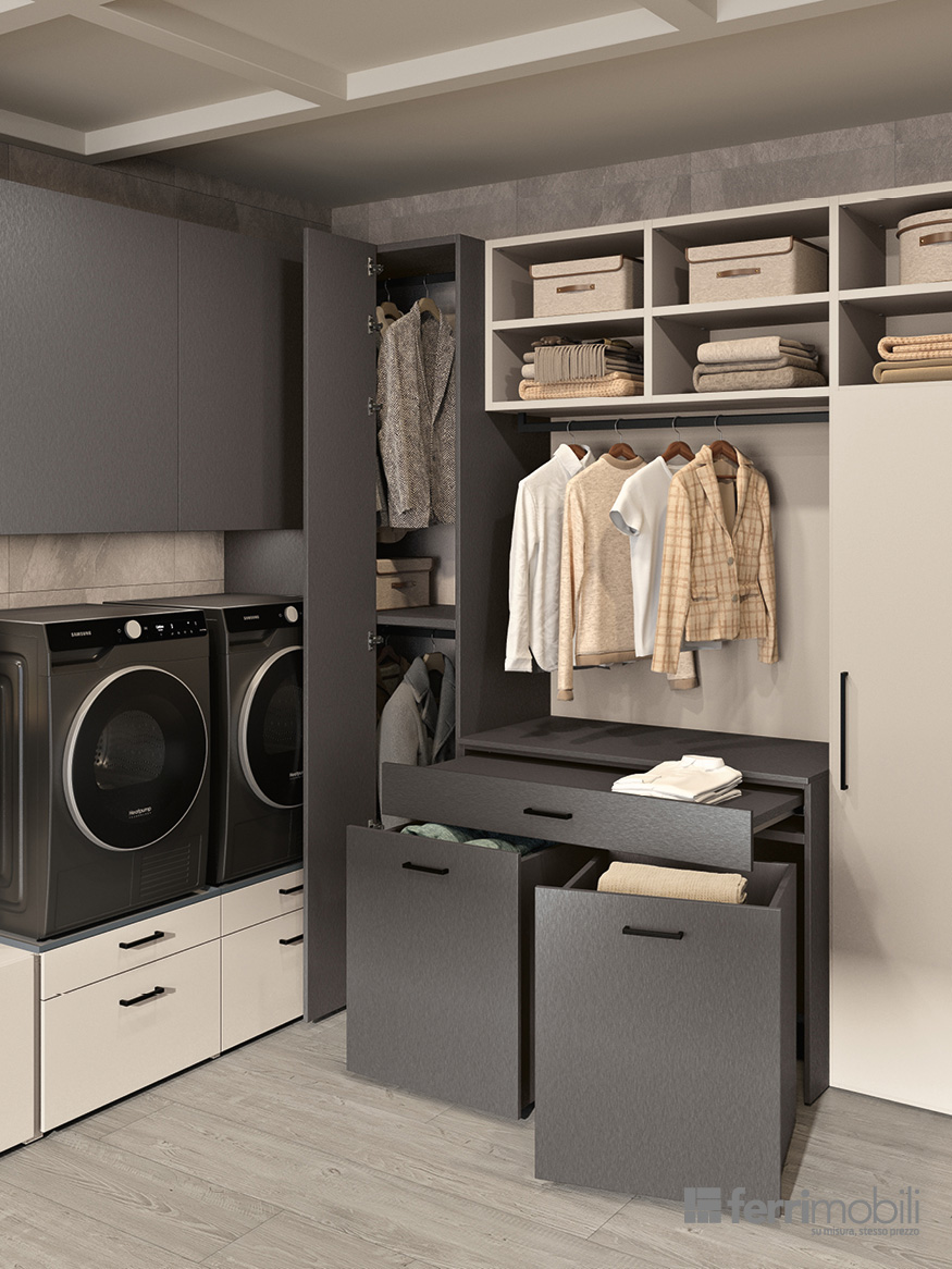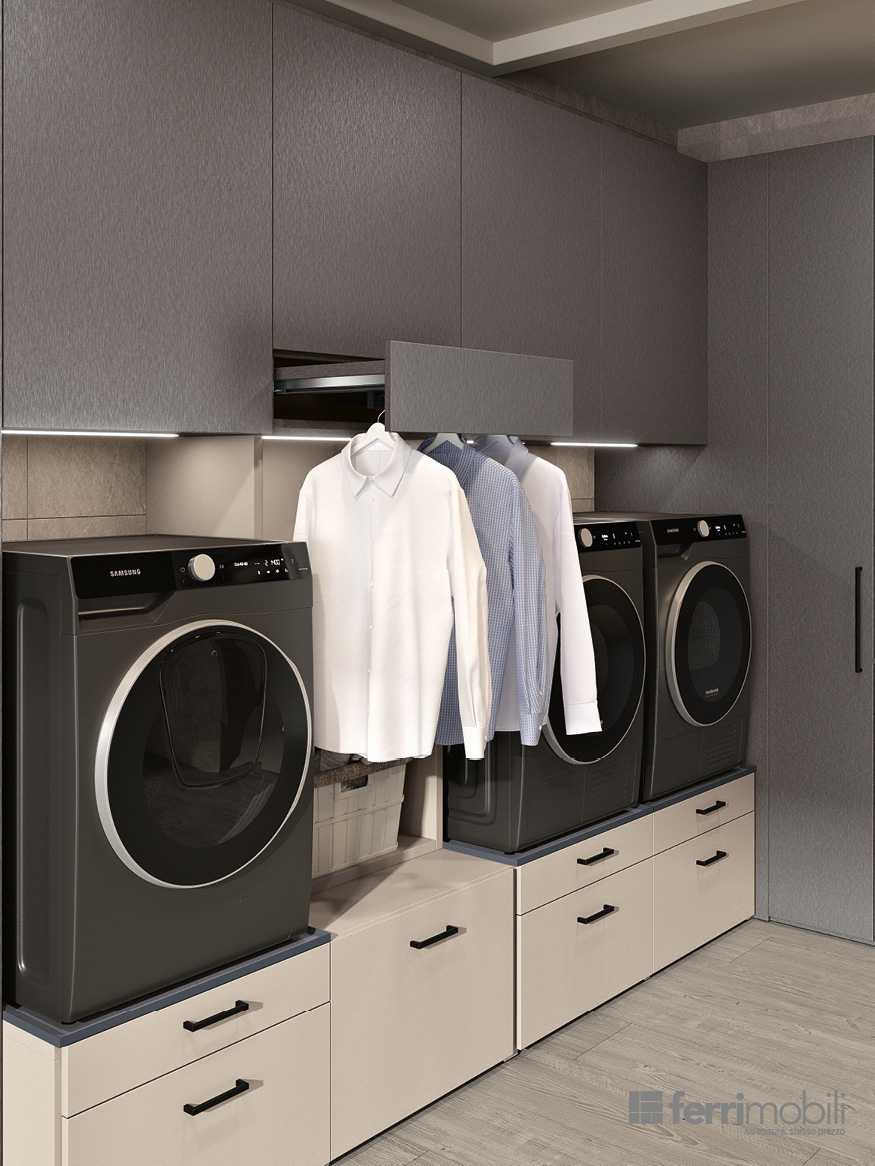 Una lavanderia ad angolo pensata per trasformare una parete in uno spazio organizzato e coerente con l’architettura della casa. Il su misura coordina ogni funzione: l’appendiabiti estraibile a scomparsa Soffio accoglie i capi appena lavati, mentre i ripiani estraibili Hulk sotto lavatrice e asciugatrice, integrati nel sostegno Podio, offrono un piano solido per appoggiare il cesto durante le operazioni di carico e scarico. I cassettoni su ruote facilitano la gestione del bucato e la porta Balance, integrata nella composizione, oltre a garantire continuità visiva, permette di separare l’ambiente lavanderia da altri ambienti della casa.