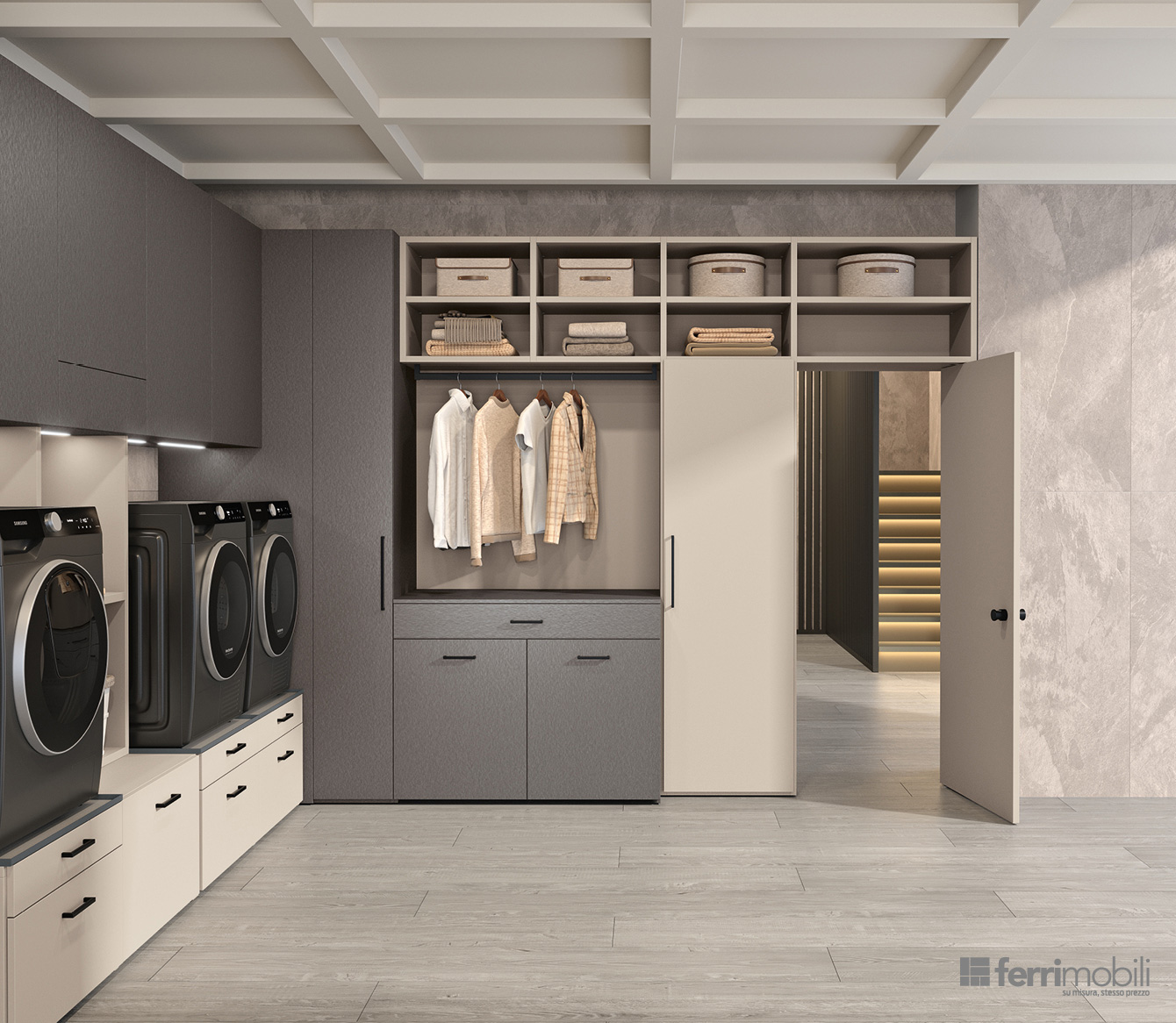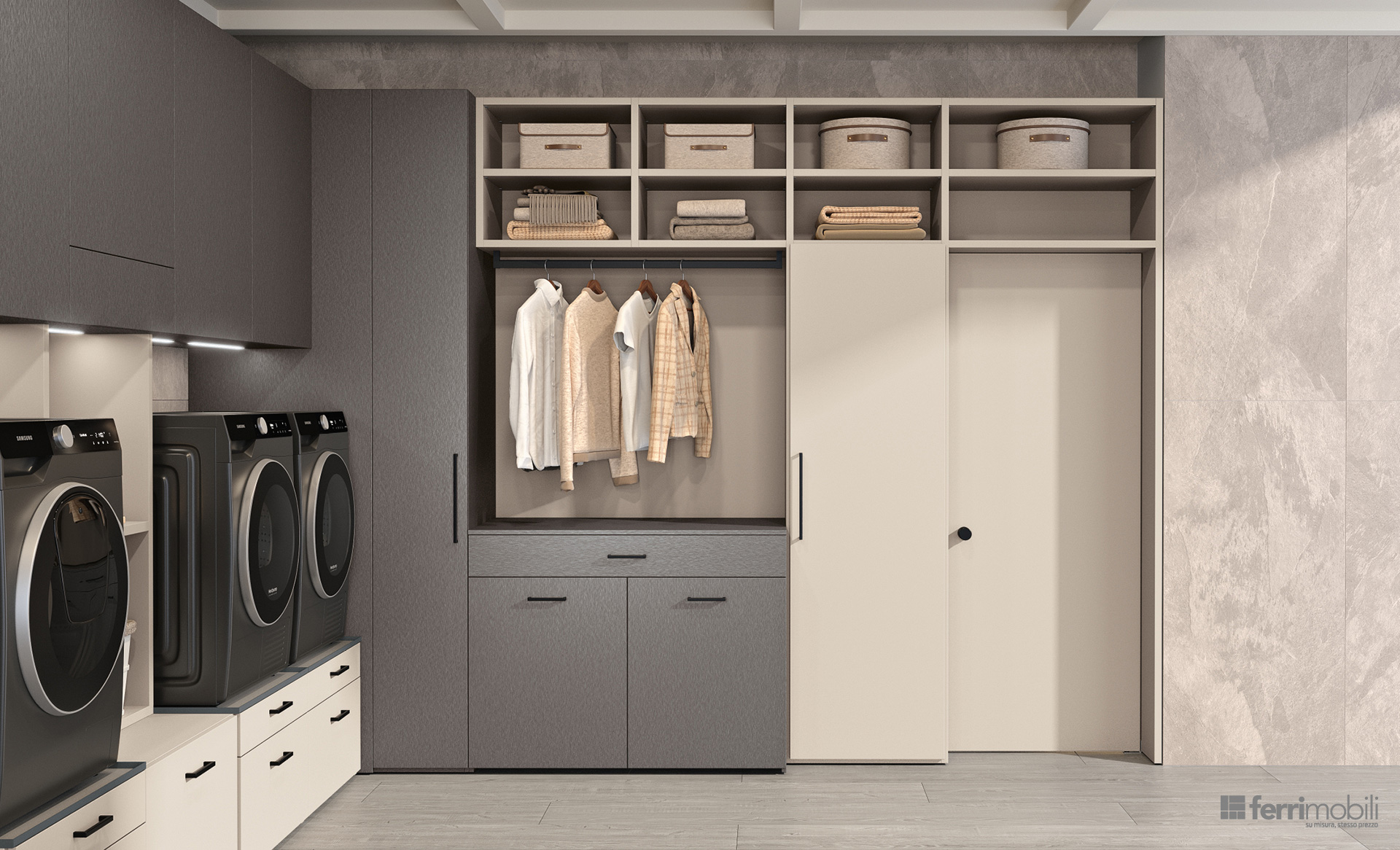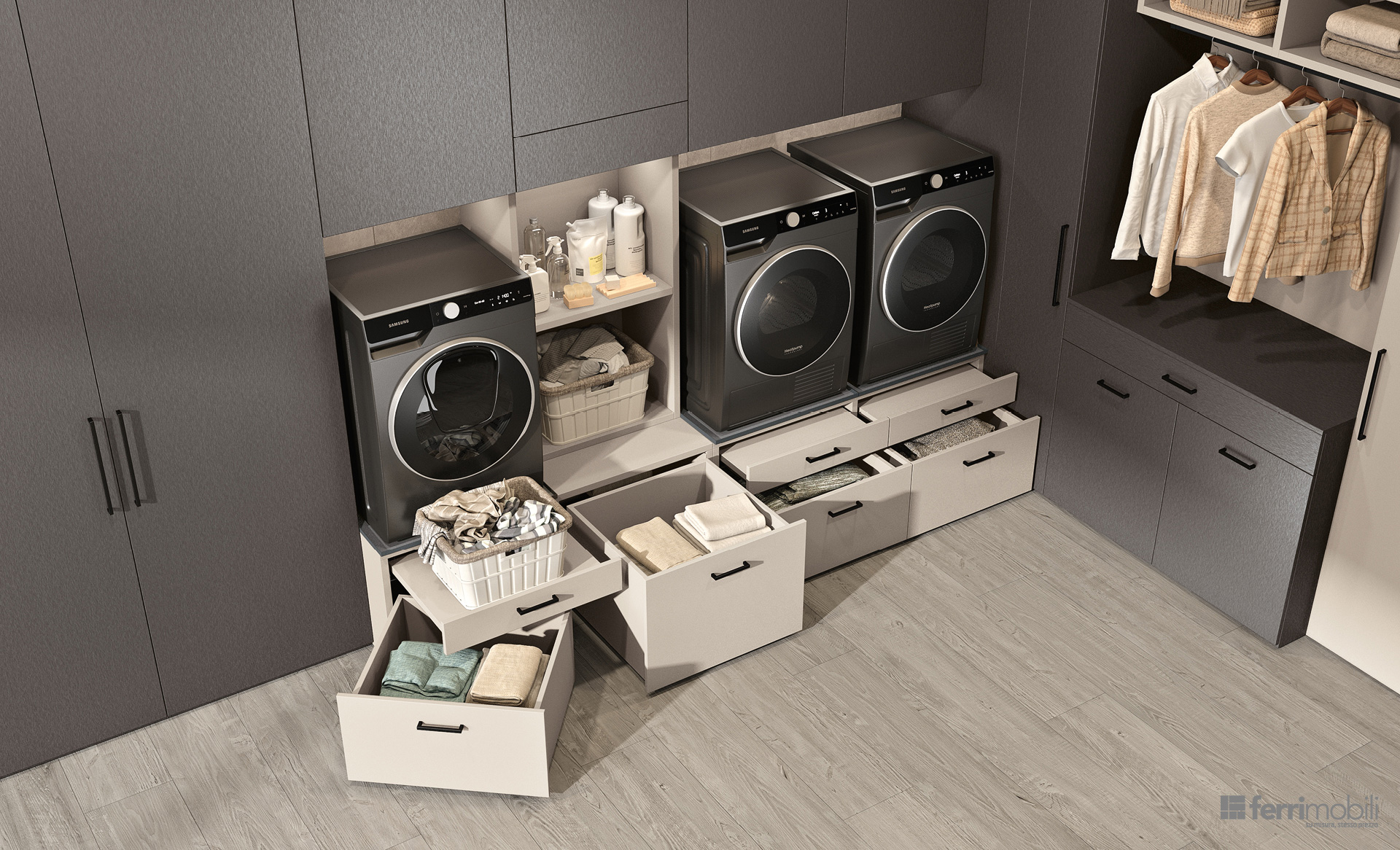 Una lavanderia ad angolo pensata per trasformare una parete in uno spazio organizzato e coerente con l’architettura della casa. Il su misura coordina ogni funzione: l’appendiabiti estraibile a scomparsa Soffio accoglie i capi appena lavati, mentre i ripiani estraibili Hulk sotto lavatrice e asciugatrice, integrati nel sostegno Podio, offrono un piano solido per appoggiare il cesto durante le operazioni di carico e scarico. I cassettoni su ruote facilitano la gestione del bucato e la porta Balance, integrata nella composizione, oltre a garantire continuità visiva, permette di separare l’ambiente lavanderia da altri ambienti della casa.