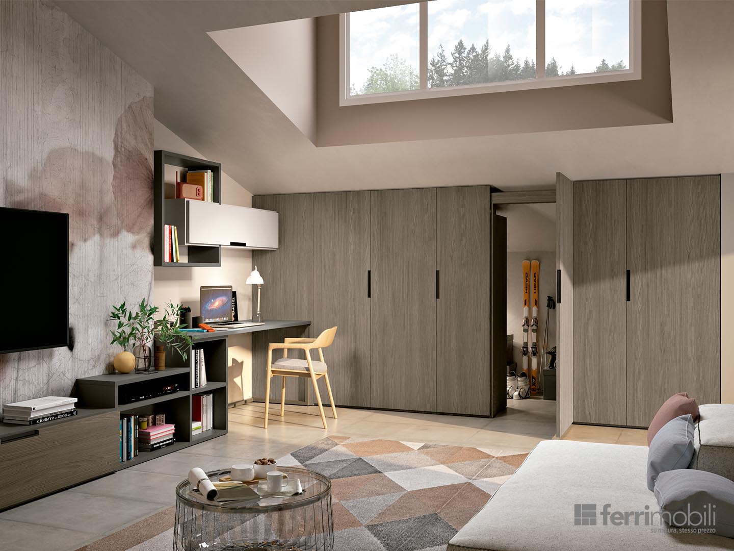 Un armadio mansardato scalare divide la zona giorno da un vano ripostiglio al quale si accede tramite portale con anta battente. L’armadio è attrezzato con i ripiani portascarpe estraibili. La parete a giorno si sviluppa grazie all’integrazione tra la libreria e la scrivania realizzabile anche con sagome personalizzate.