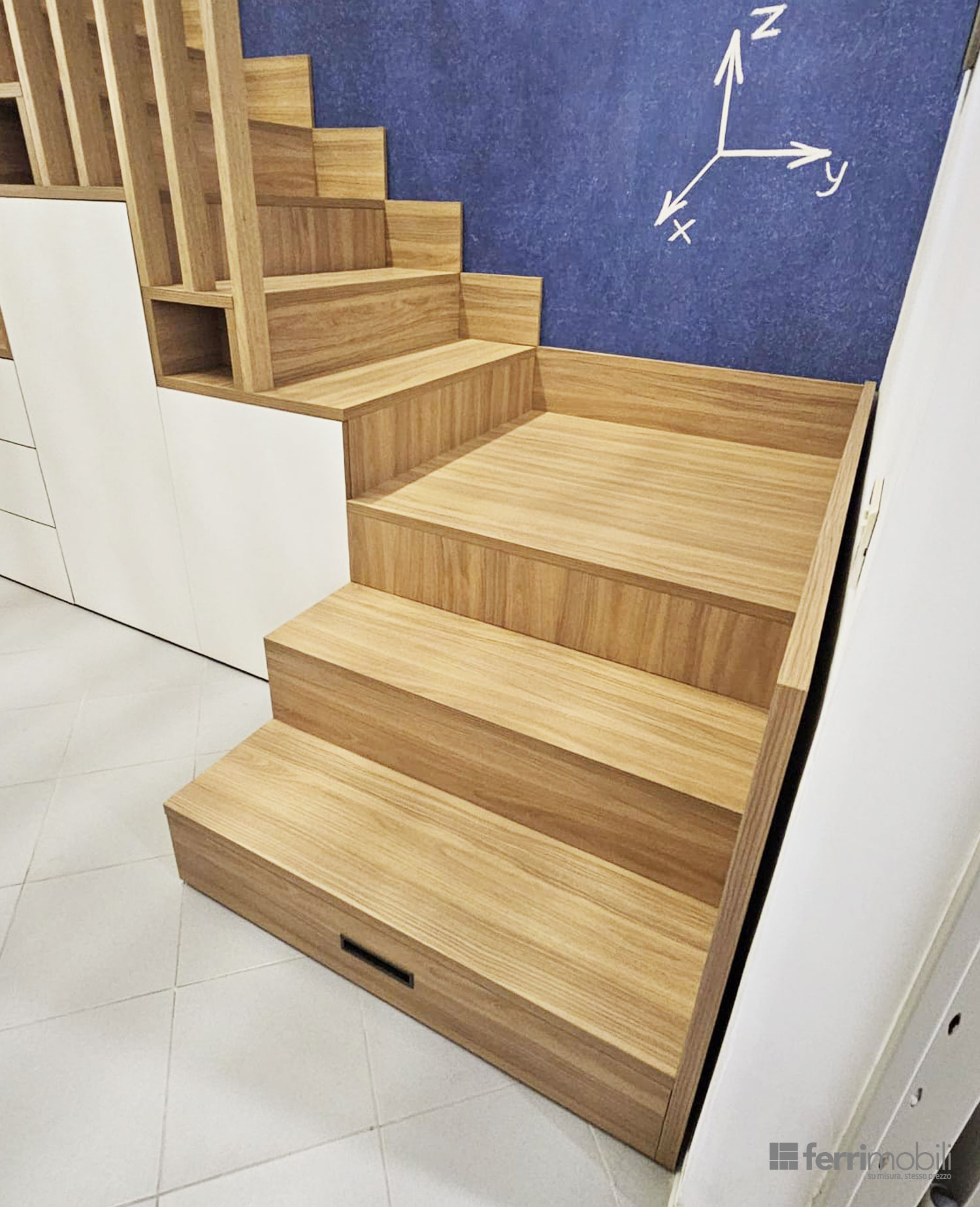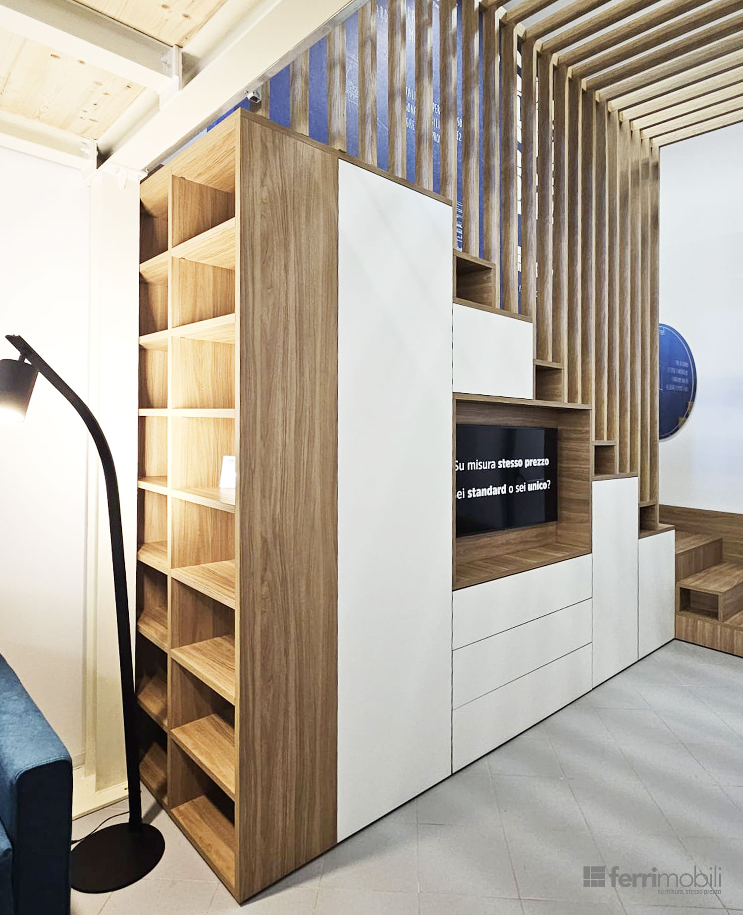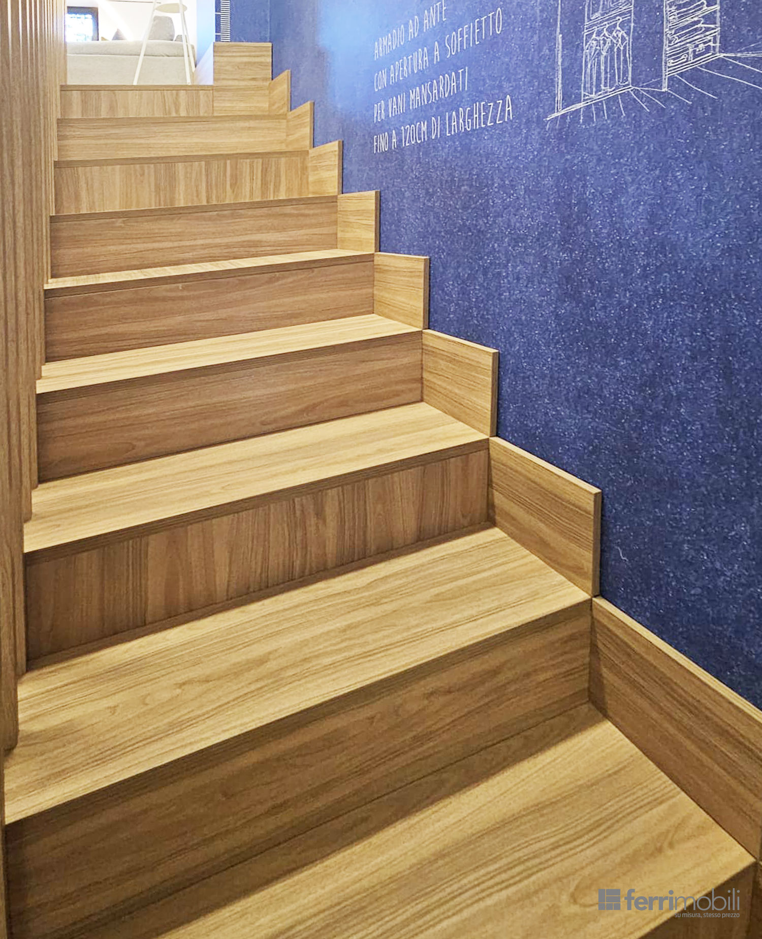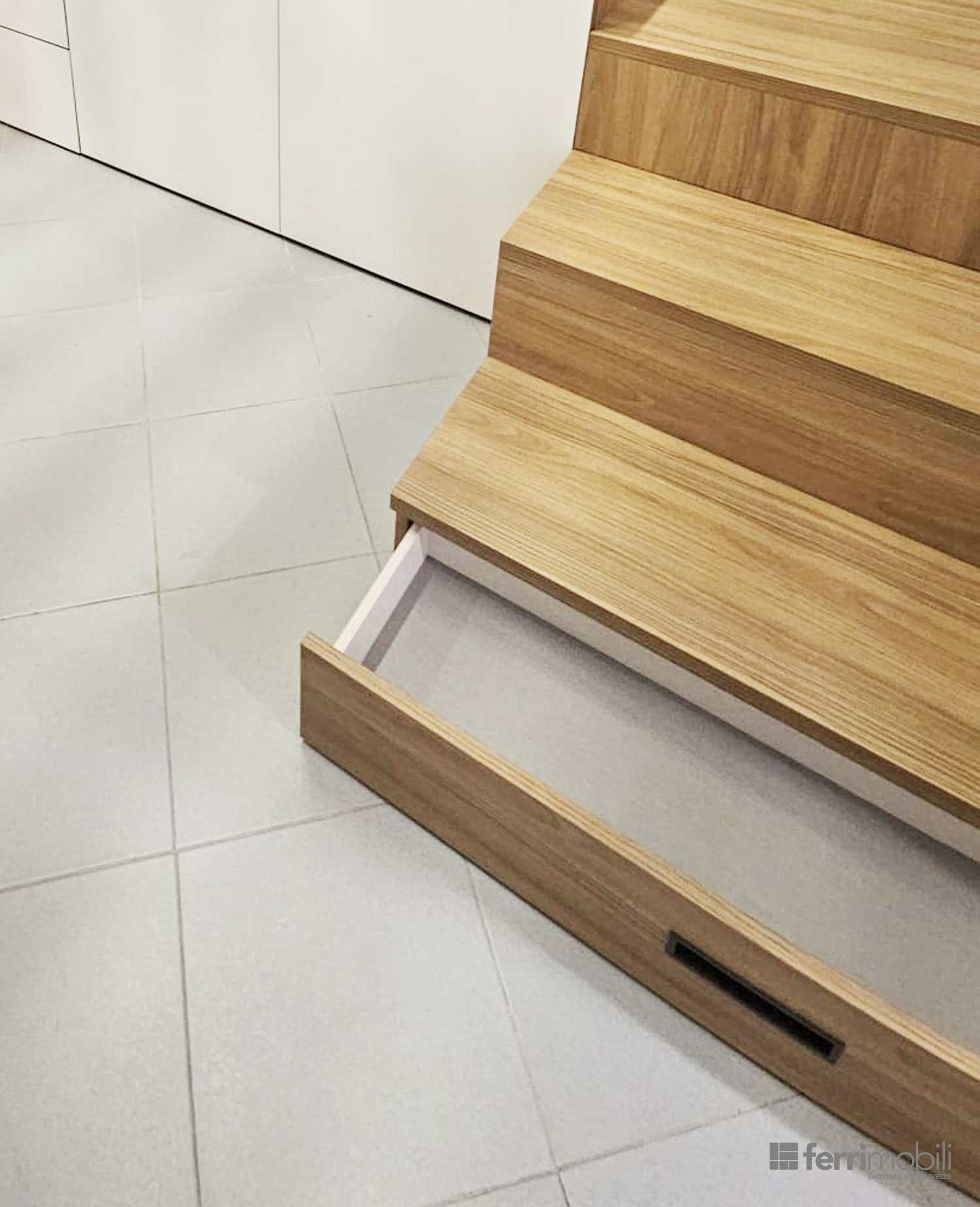 La struttura alterna ante chiuse, cassetti capienti ed elementi a giorno, creando un equilibrio tra contenimento nascosto e spazi espositivi. Ogni modulo viene dimensionato in base all’altezza progressiva della scala, garantendo proporzioni armoniche e massima sfruttabilità interna.