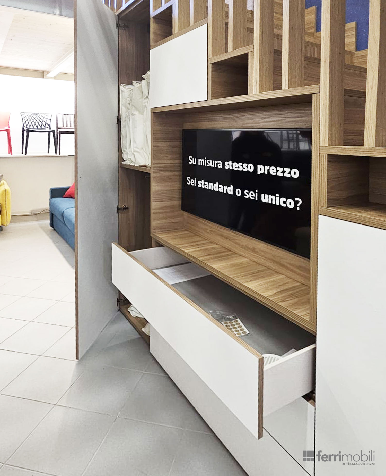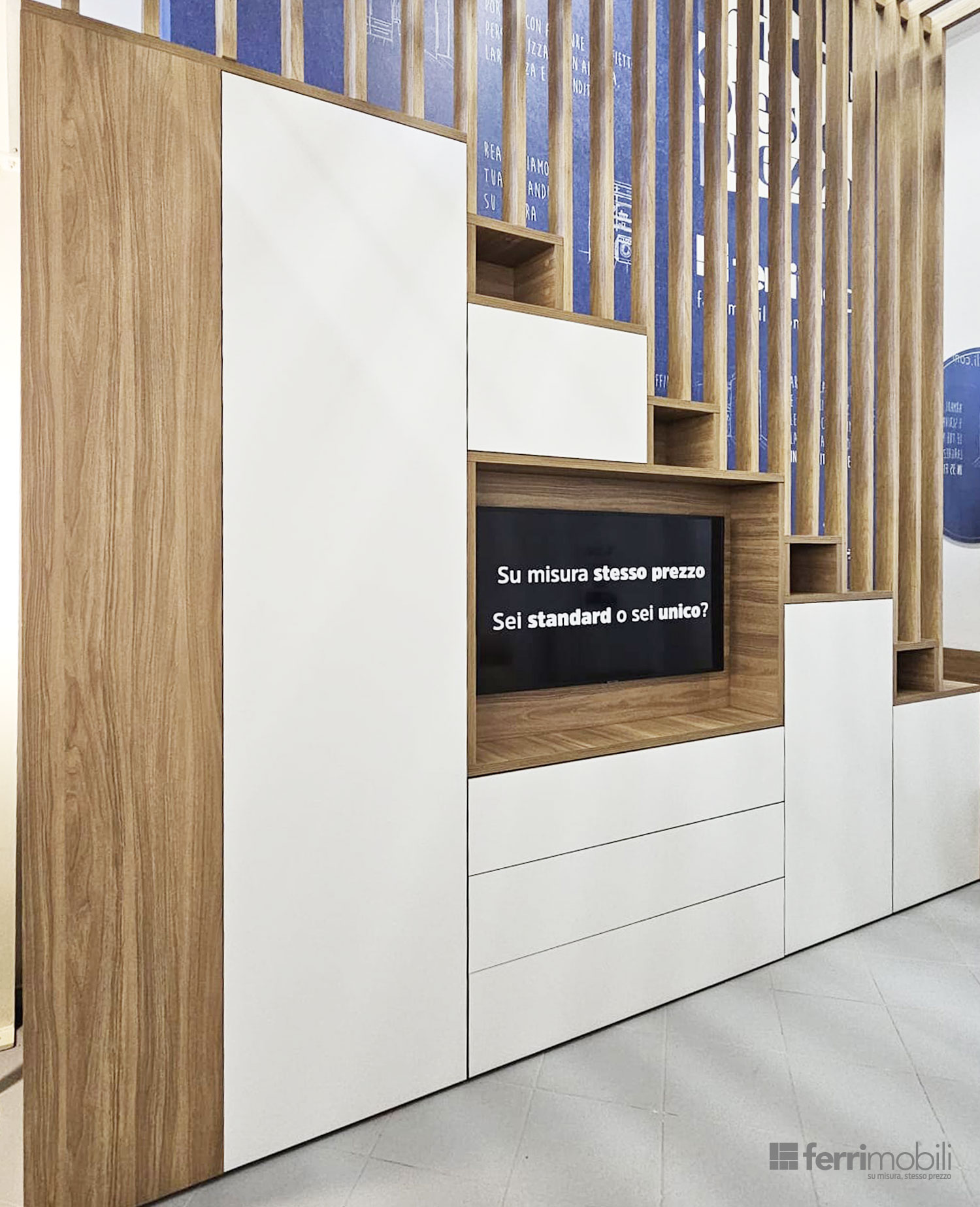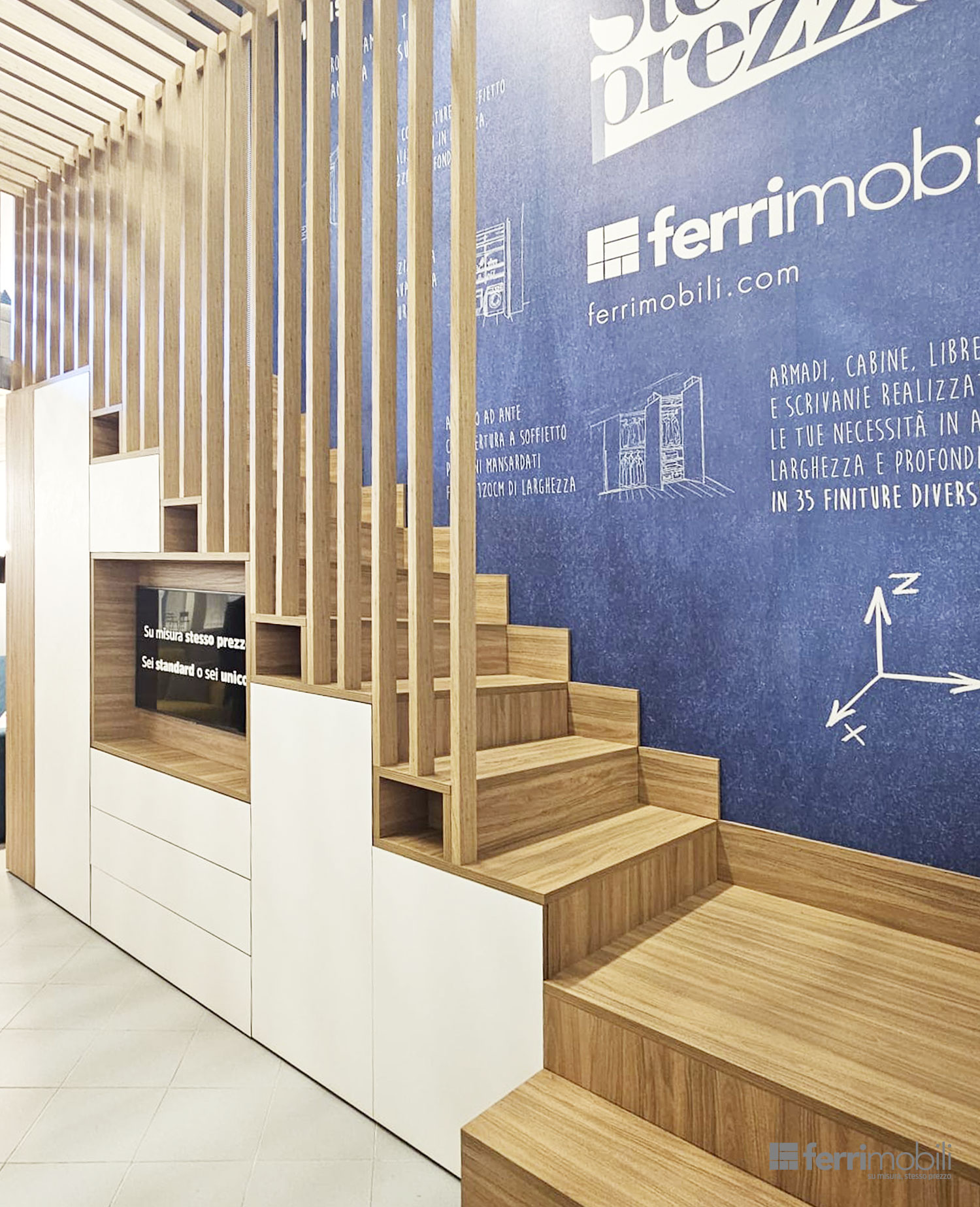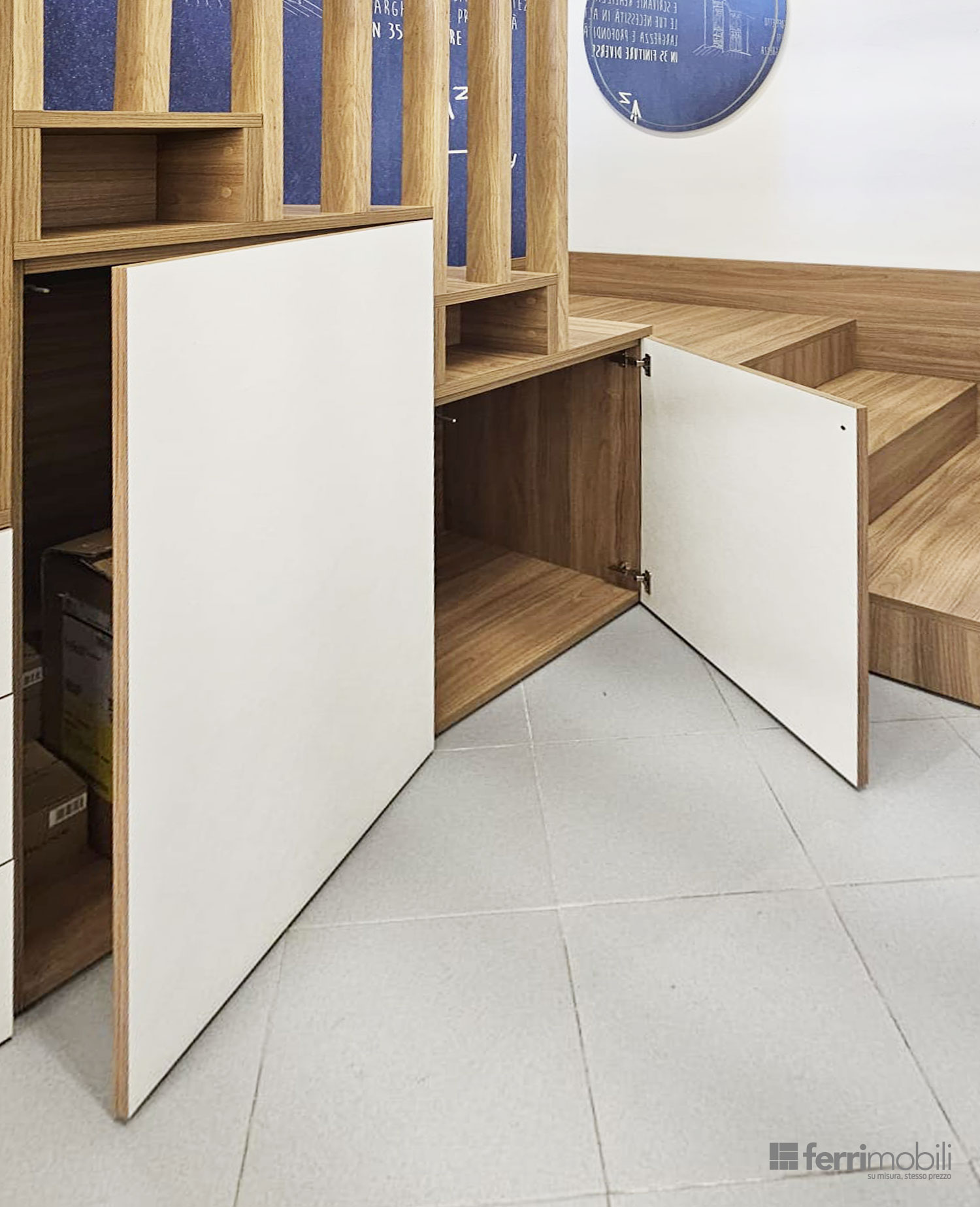 La struttura alterna ante chiuse, cassetti capienti ed elementi a giorno, creando un equilibrio tra contenimento nascosto e spazi espositivi. Ogni modulo viene dimensionato in base all’altezza progressiva della scala, garantendo proporzioni armoniche e massima sfruttabilità interna.