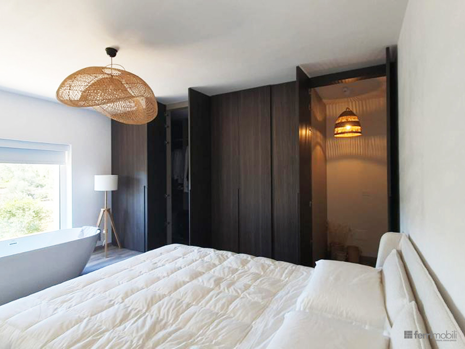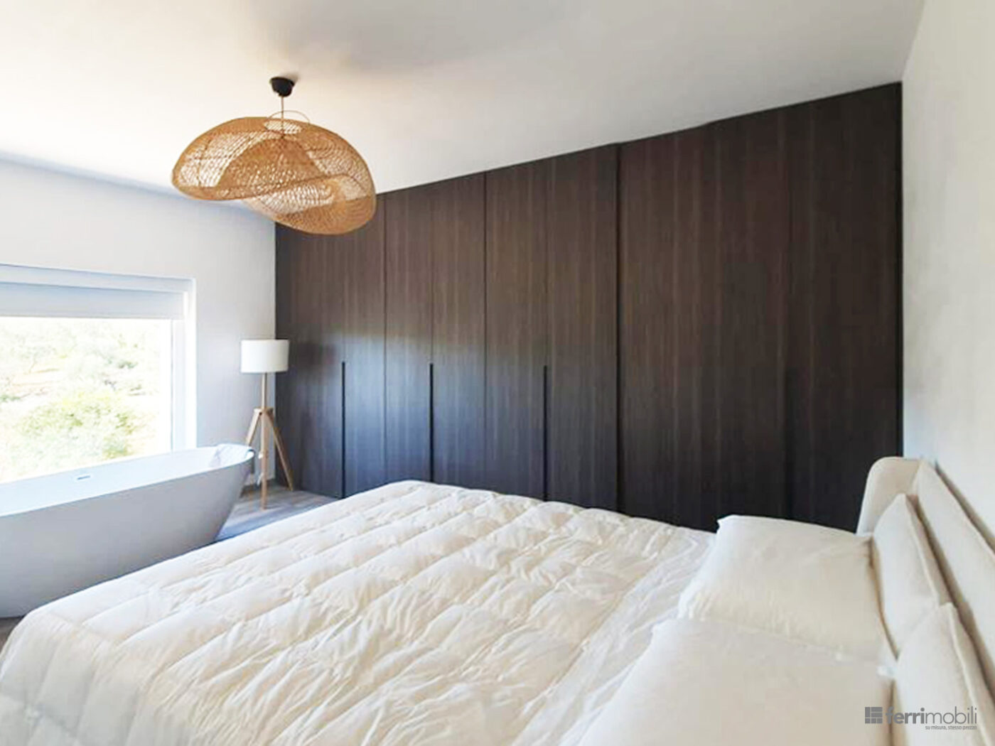 Una soluzione che unisce letto matrimoniale, armadio e cabina armadio in un unico progetto coordinato, dove design e funzionalità convivono in equilibrio.
