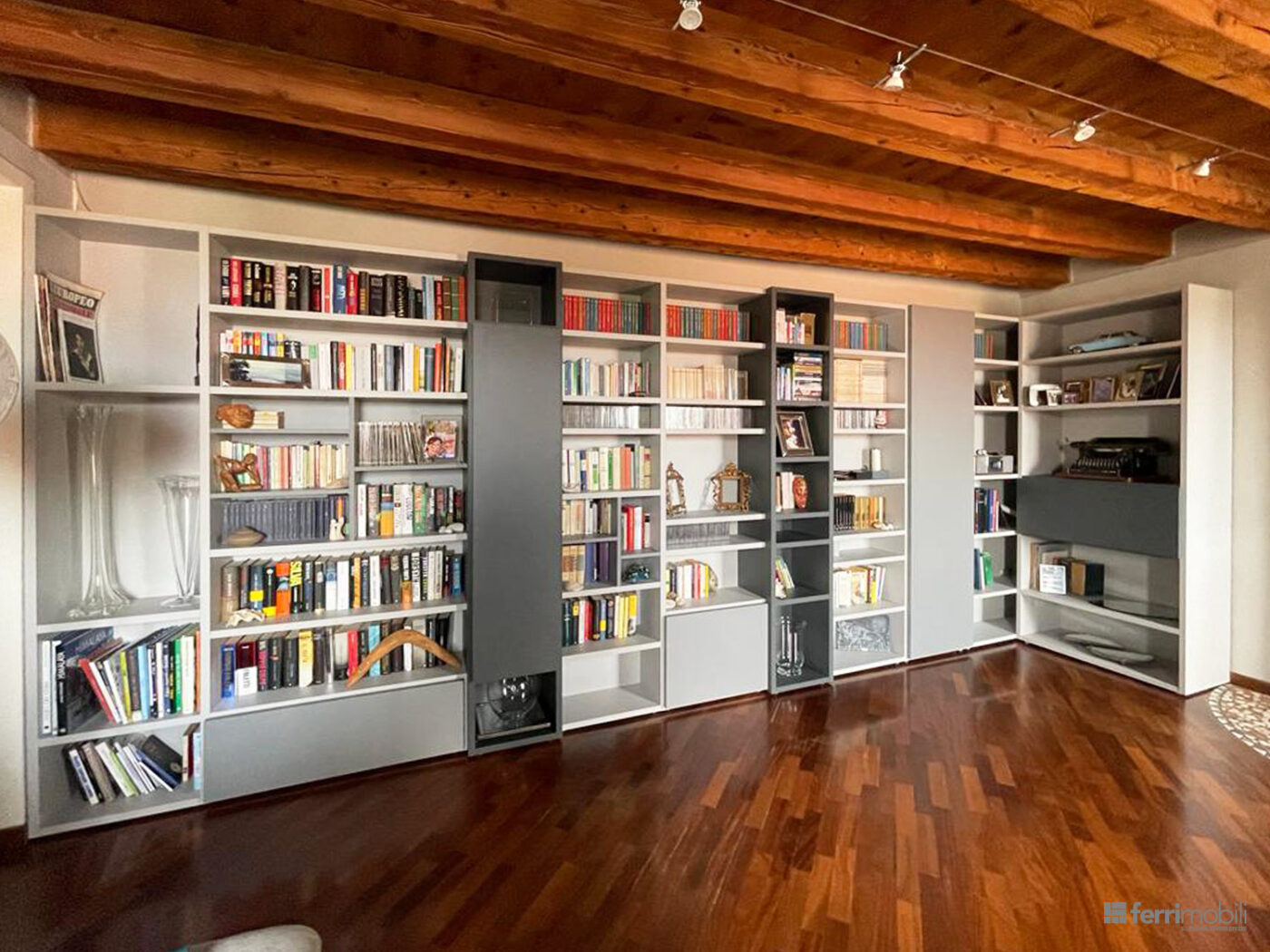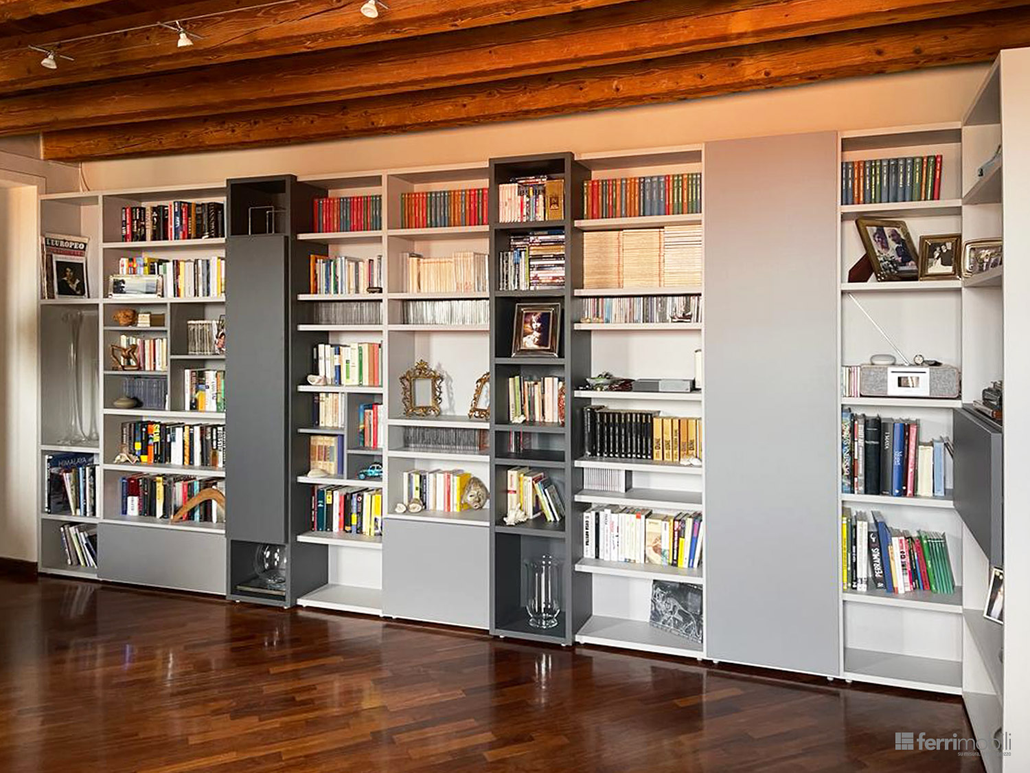 Questa libreria su misura a tutta parete è progettata per organizzare lo spazio del soggiorno con una composizione ampia e articolata che valorizza l’intera parete dell’ambiente. La struttura si sviluppa lungo tutta la lunghezza della stanza, creando una soluzione capace di unire contenimento, esposizione e design.