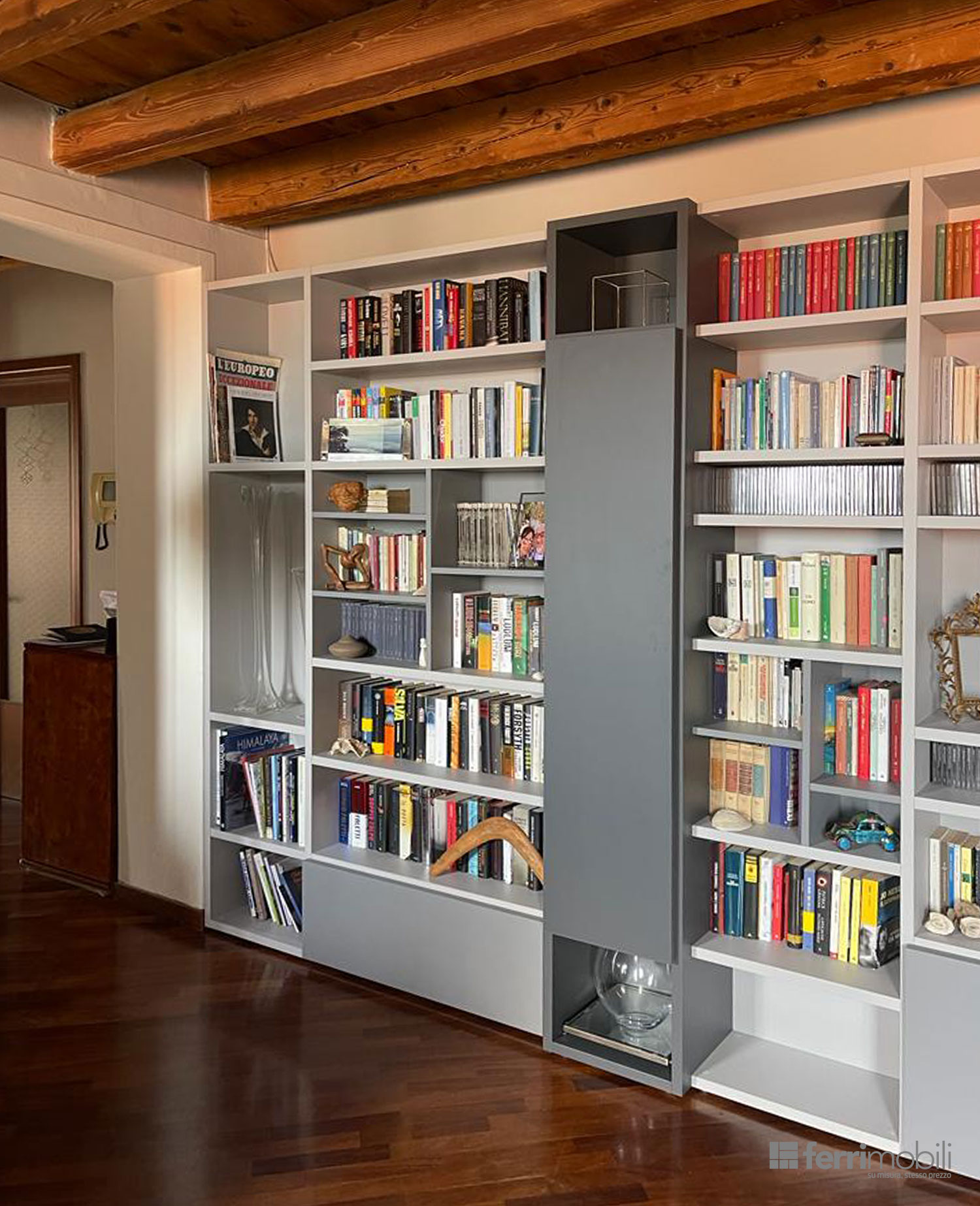Alcuni moduli verticali chiusi introducono una variazione materica e funzionale all’interno della composizione, offrendo spazio contenitivo aggiuntivo e creando un interessante contrasto con le parti aperte della libreria.