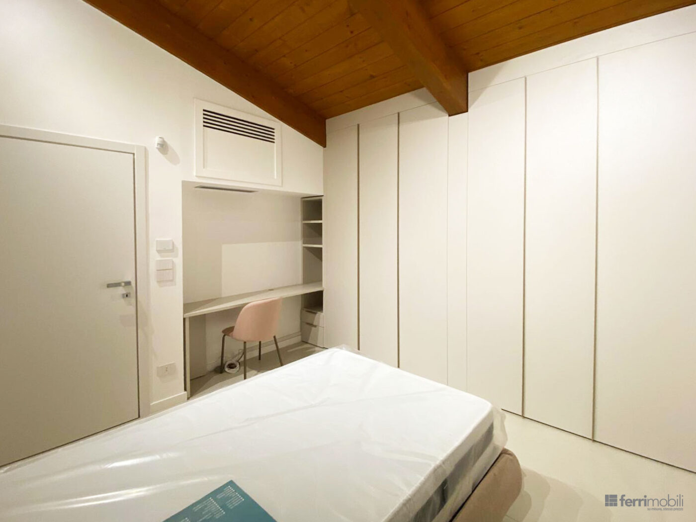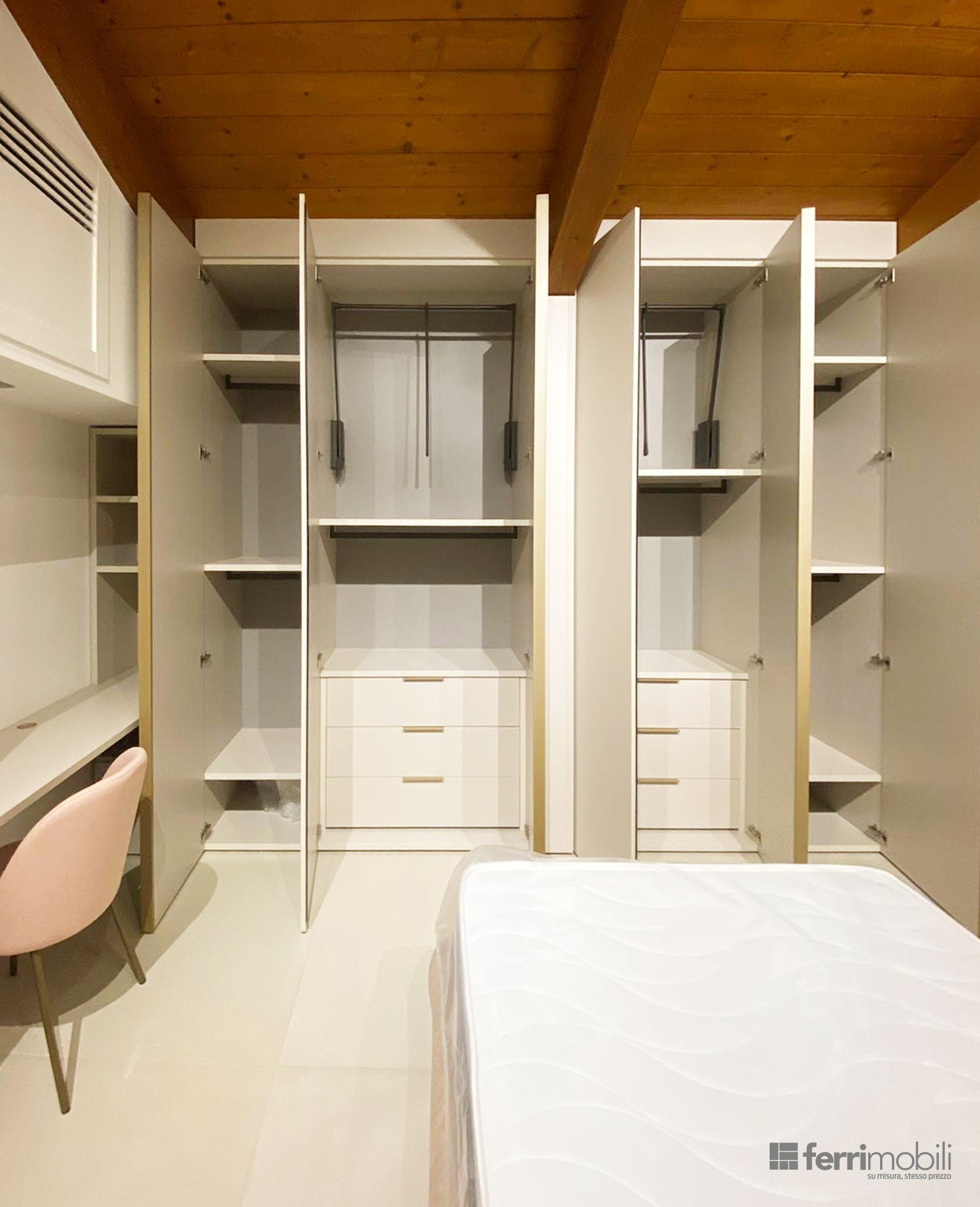 Armadiatura per camera mansardata con soffitto a travi