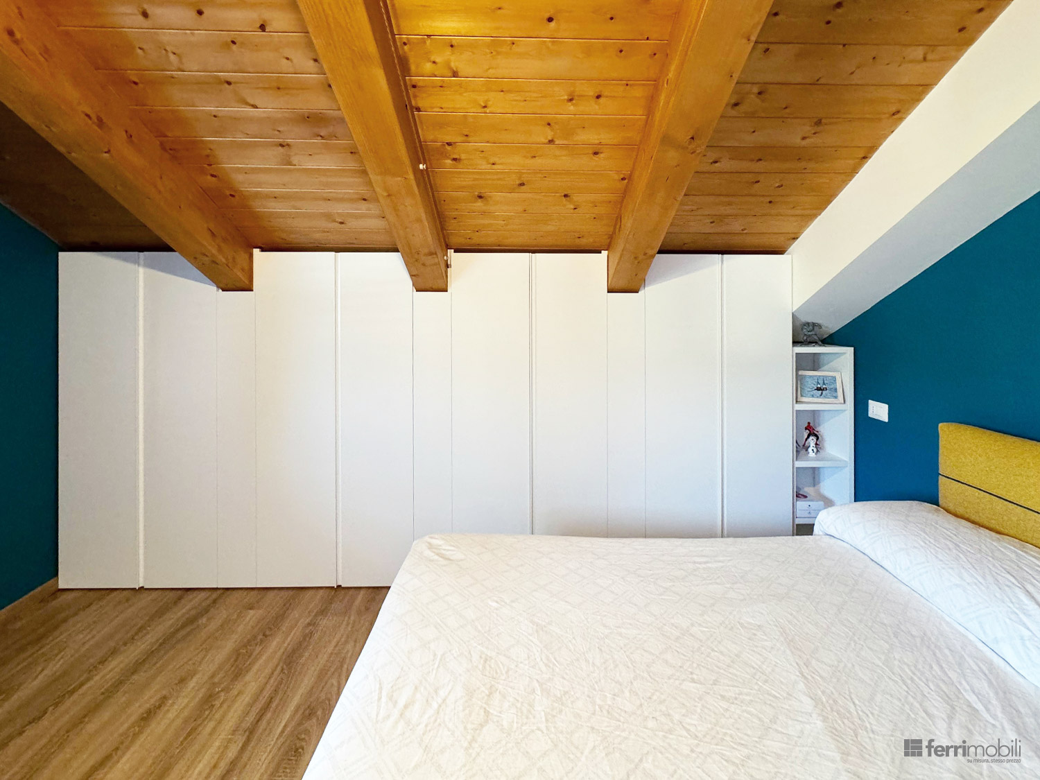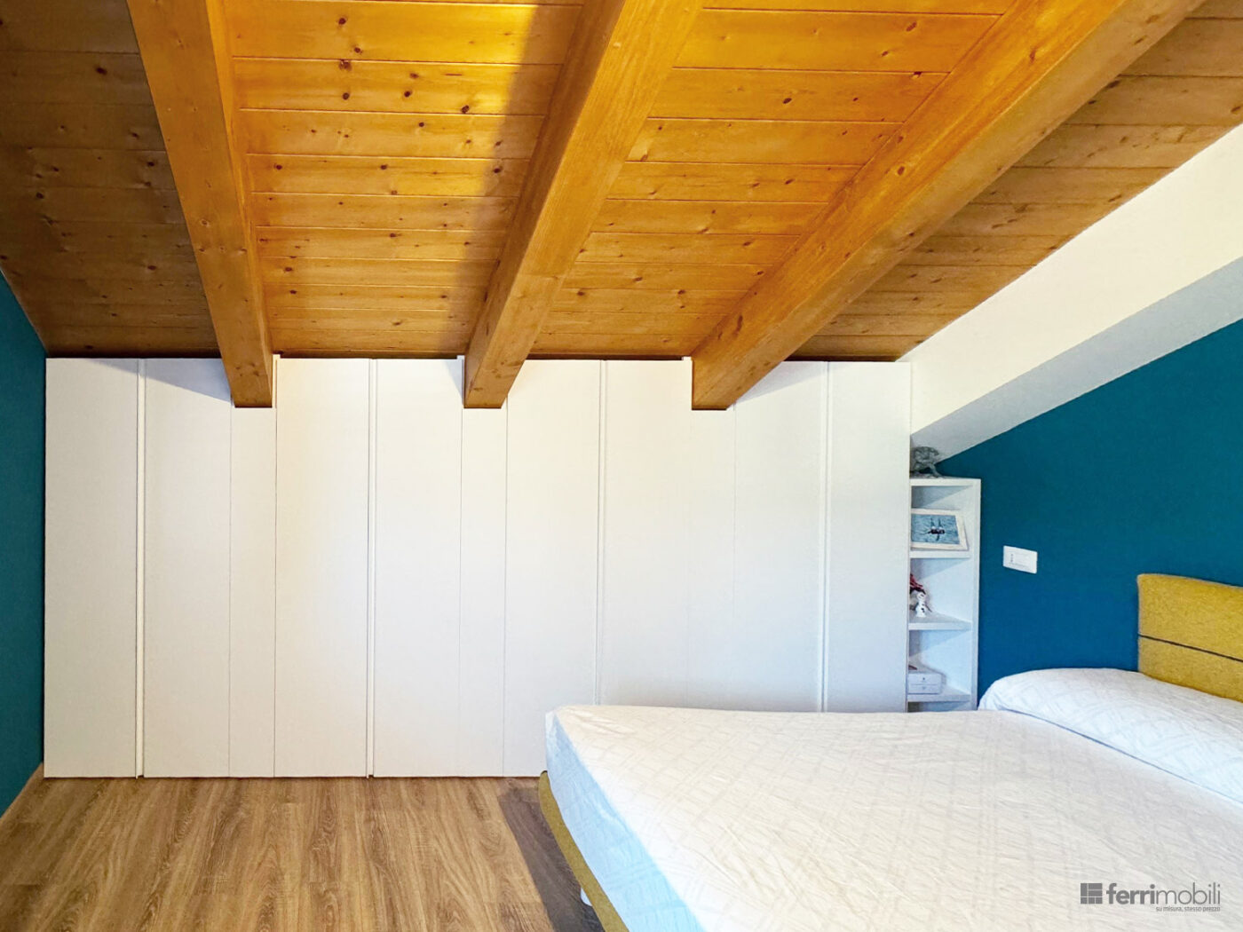Armadio mansardato su misura per camera da letto con travi a soffitto