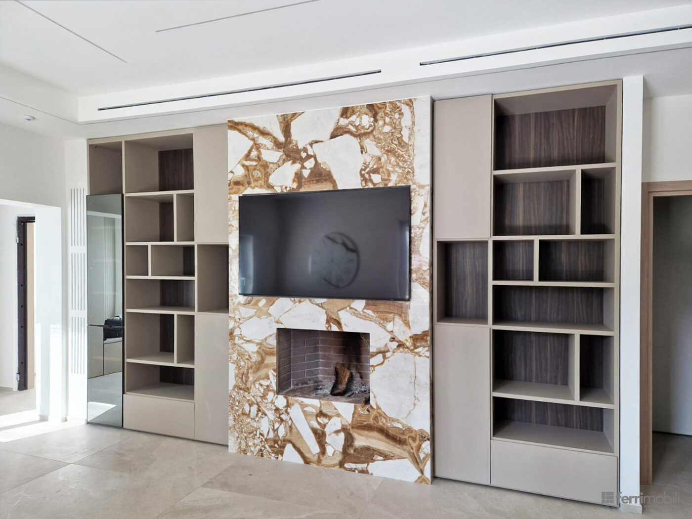 Il televisore trova spazio sopra il camino, incorniciato da una superficie decorativa che valorizza l’area centrale della composizione e crea un forte impatto estetico. Ai lati del vano TV si sviluppano due librerie verticali progettate per ospitare libri, oggetti decorativi e accessori, contribuendo a rendere la parete dinamica e perfettamente organizzata.