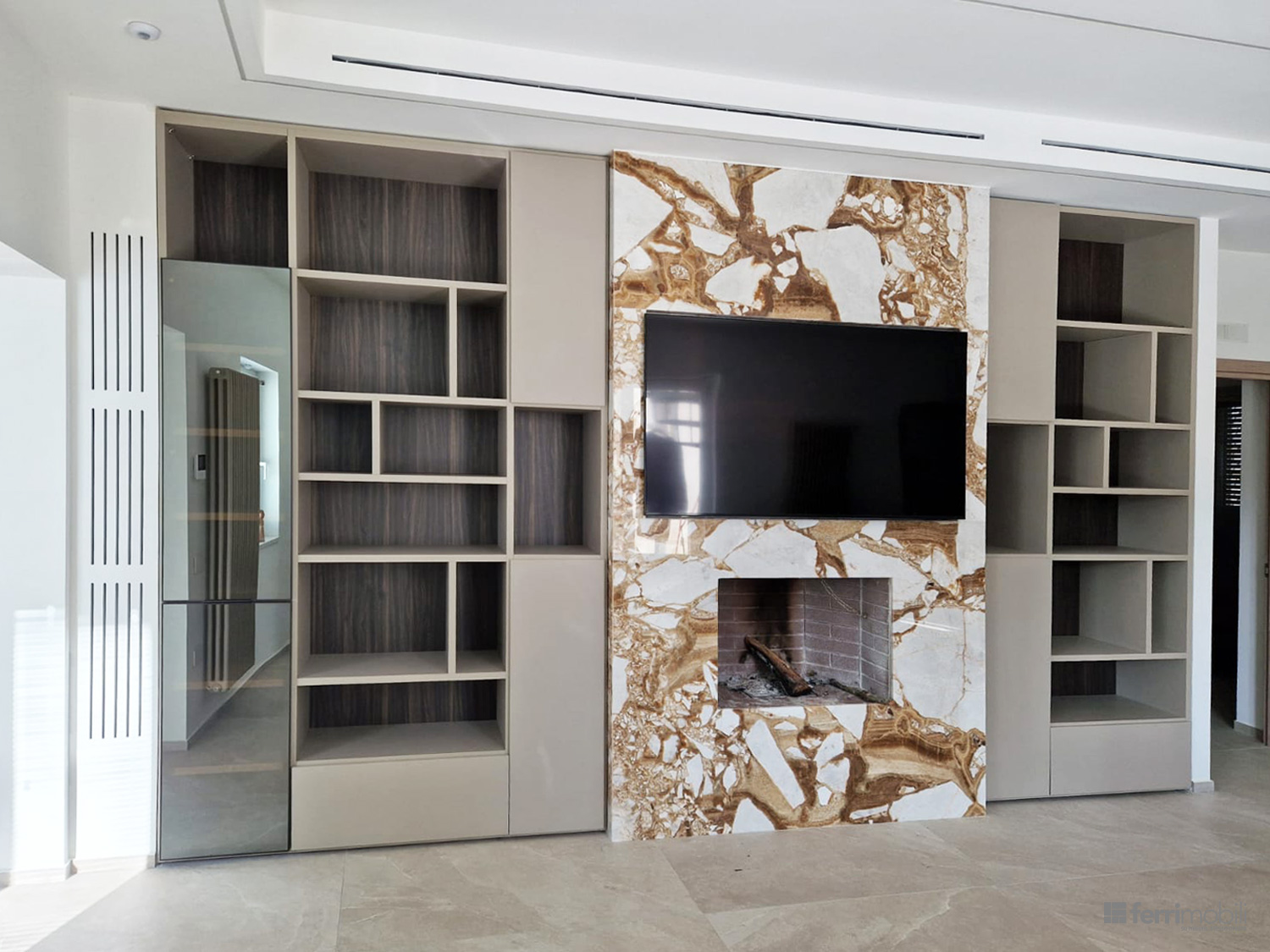 Parete attrezzata su misura per zona living con vano TV e camino (MIS MF 5154)