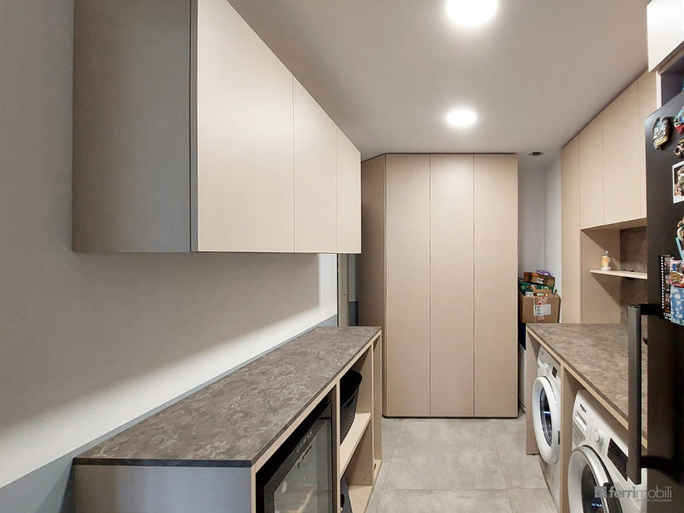 La composizione integra basi contenitive, pensili a tutta altezza e un ampio piano di lavoro continuo, ideale per organizzare le attività quotidiane. Lavatrice e asciugatrice trovano collocazione sotto il piano, mentre i moduli superiori e laterali offrono spazio per detersivi, accessori e contenitori.